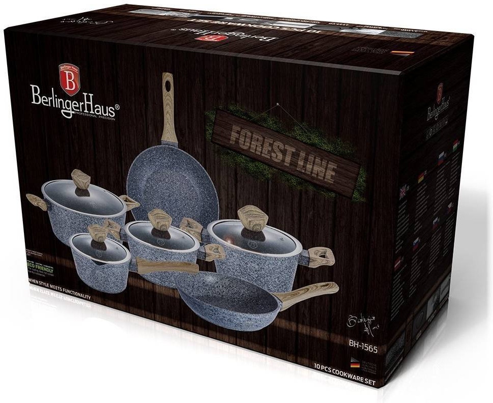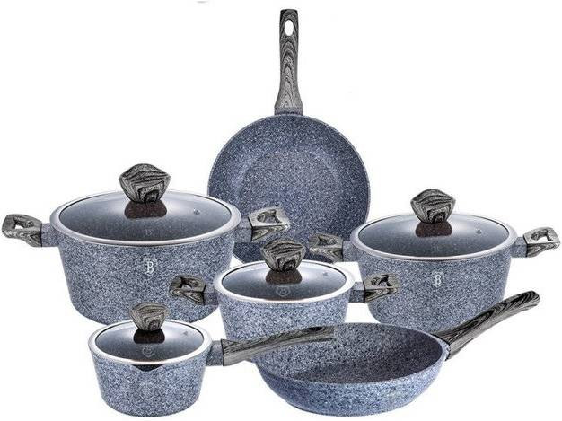 • в наборе сковородок и кастрюль Berlinger Haus все компоненты имеют мраморное напыление. По прочности такая посуда превосходит керамическую и тефлоновую, потому что более устойчива к царапинам и долговечна в использовании;