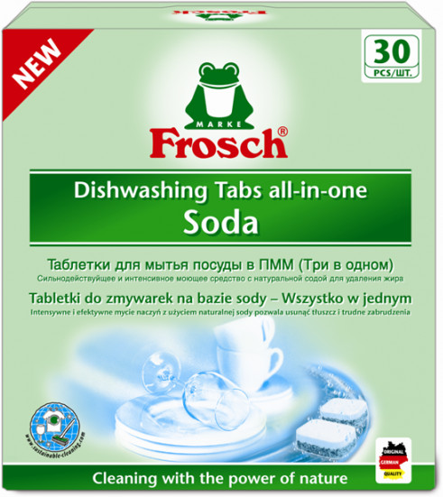 Frosch Таблетки для мытья посуды в посудомоечной машинеВ данный момент этот товар отсутствует в продаже. Возможно, у нас найдется аналогичный или похожий товар здесь. Моющее средство: состав с натуральной содой удаляет даже засохшие остатки пищи. Ополаскиватель: сияющий блеск посуды и стаканов без пятен от воды. Функция соли: надежно предотвращает отложение известкового налета. Средство для защиты стекла: противодействует помутнению стекла и сохраняют блеск. Дополнительная соль необходима лишь для воды с жесткостью, превышающей 21dH (жесткость воды по немецкой шкале). Блеск для нержавеющей стали: блестящая нержавеющая сталь без дополнительной полировки. Растворитель засохших остатков пищи: растворяет даже трудно отмываемые, засохшие остатки пищи, например, от рубленого мяса, овсяных хлопьев, горчицы, яиц и молока. Незначительное потребление энергии: сверкающая чистая посуда уже при температуре от 40 градусов. |