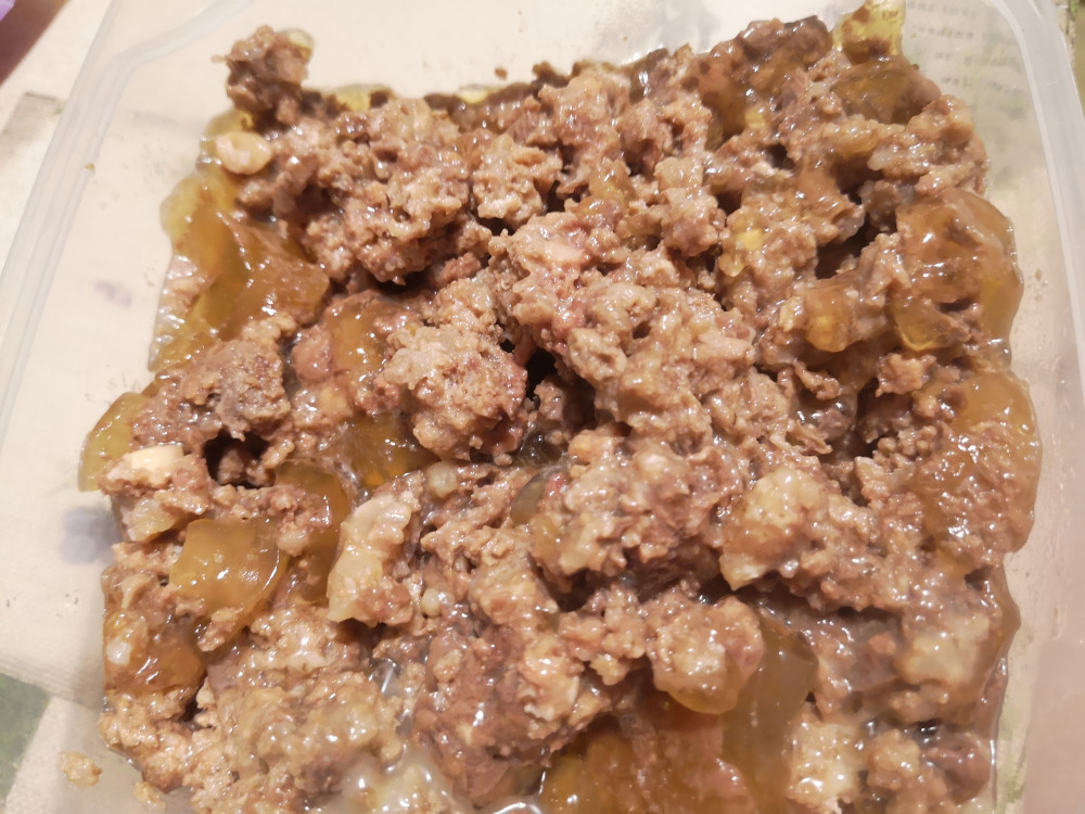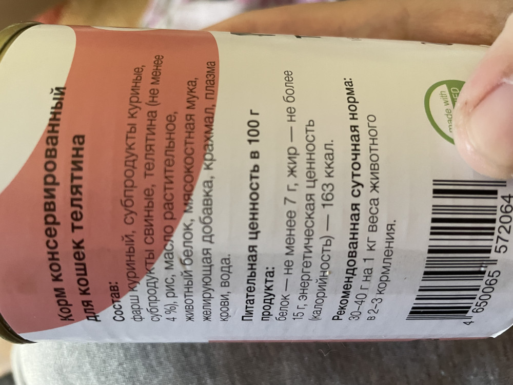 Корм хороший по составу, кошка ест. Банку растягиваем на 4-5 вечеров. Что бы кошка по ночам не пела с голоду. Запах очень даже приятный и на вид вроде сплошное мясо. Храню в холодильнике в контейнере, перед "подачей" немного грею.