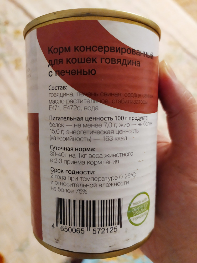 Производитель сменил этикетку, когда распаковала посылку, даже испугалась, что по ошибке положили другие консервы. На сайте фото товара в старом дизайне. Срок годности хороший, запах и консистенция тоже, но в этот раз у двух кошек из четырех случилась туалетная оказия после ужина этими консервами, поэтому снимаю 1 звезду. Раньше такого никогда не было, продукция Organix всегда заходила на ура.