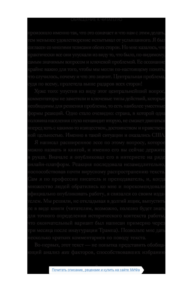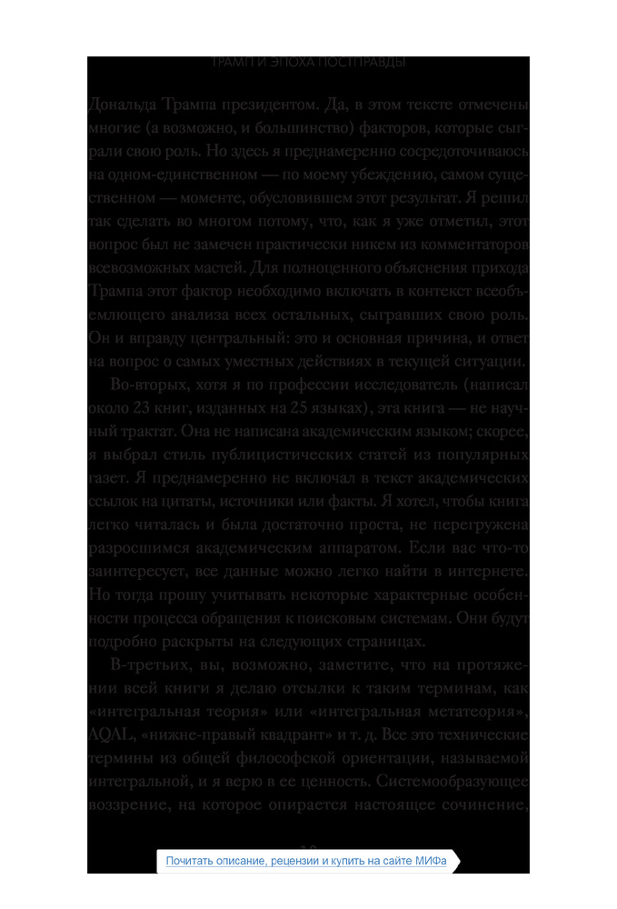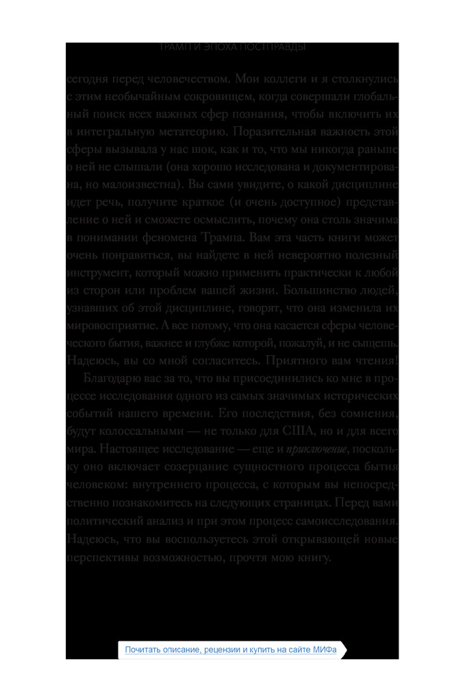 Книга не только помогает разобраться в причинах прихода к власти этой «новой» силы — олицетворяемой сейчас Трампом. Она служит противоядием от крайних — и разрушительных — форм культуры постмодерна. Помогает избежать ошибок, совершённых в странах Запада, где постмодернизм занял положение «эволюционного авангарда» интеллектуальных и культурных ценностей (не справившись со своей задачей).