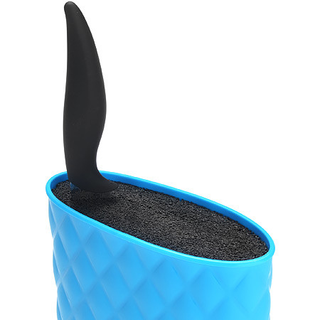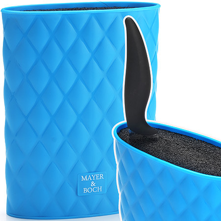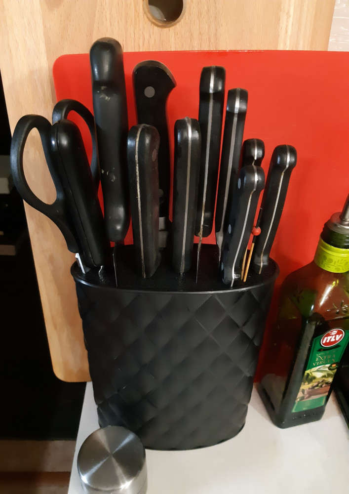 Классная вещь! Покупала черный, ножи легко втыкаются, около 7-8 ножей вместилось спокойно. Очень понравилось!