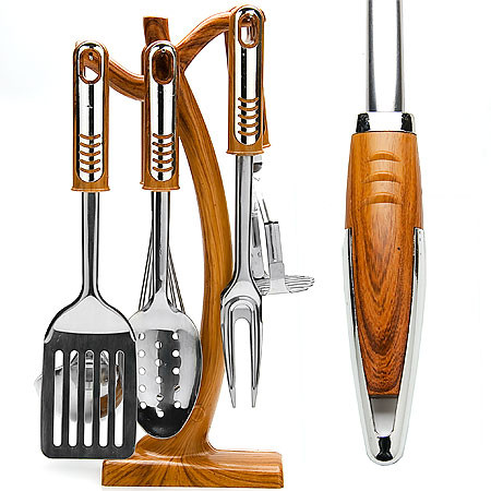 Этот профессиональный кухонный набор очень удобен в использовании, имеет стильную подставку из пластика, стилизованного под дерево, которая прекрасно впишется в любой кухонный интерьер. Изделия снабжены удобными нескользящими ручками из термопластика, защищающими Ваши руки от ожогов. Высококачественная нержавеющая сталь CrNi 18/10, из которой выполнены рабочие поверхности, идеально подходит для приготовления пищи, предметы набора не окислятся со временем и не испортят вкус Ваших блюд. Кухонный набор придаст Вашей кухне элегантность, поднимет Ваше настроение и превратит приготовление еды в настоящее удовольствие!