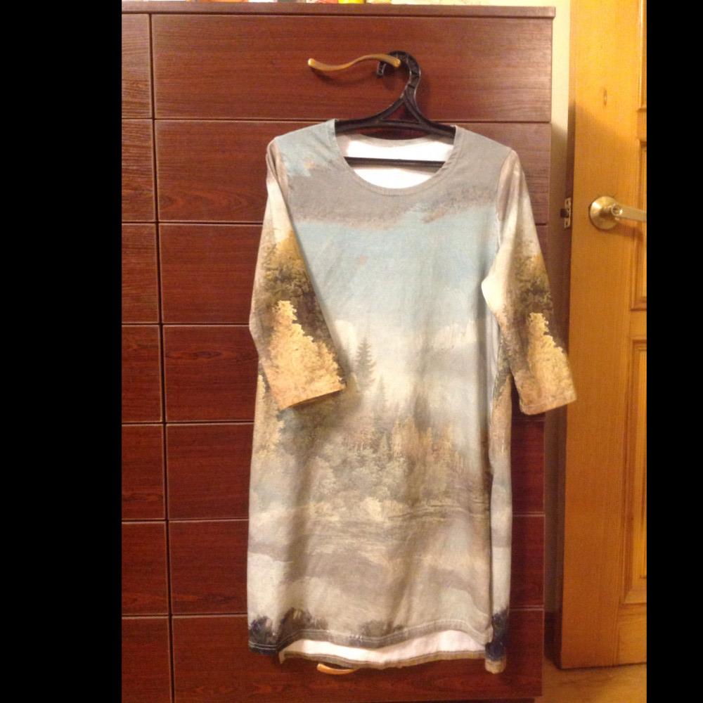 Туника другой расцветки, больше зеленовато-салатного цвета. Рукава вообще словно кусок от другой, по тональности, ткани. Рисунок на переде тоже отличается, и более блеклый. Оставила, разве что дома ходить.🤔. Размер выбирайте по размерной сетке. Он отличается от обычных размеров. А то многие пишут, что маломерка. Пробовала сделать фото. Цветопередача искажается. Получается не то, что есть в реальности.