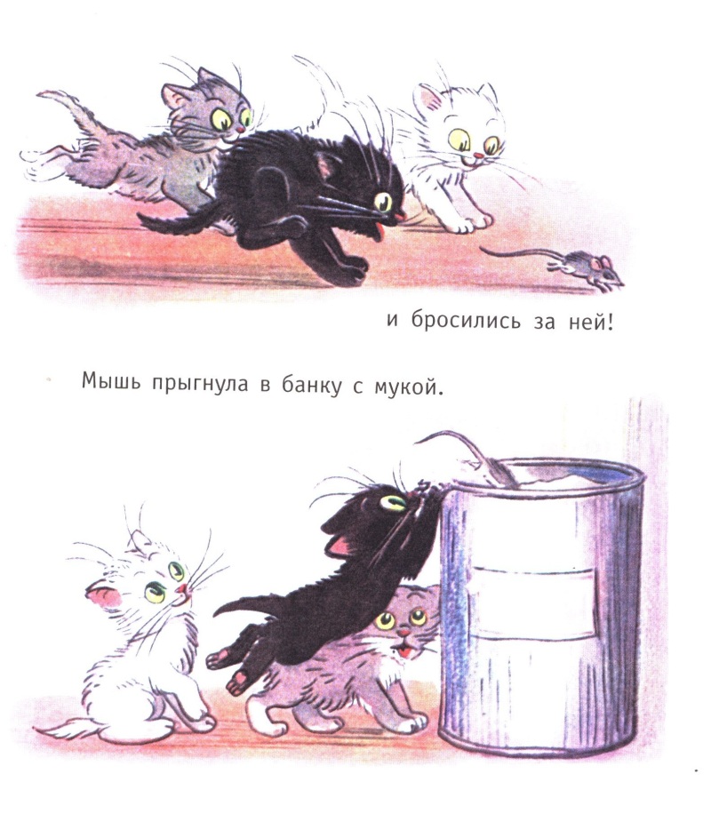 Формат книги удобный для ребёнка - между средним и маленьким. Твёрдый переплёт удобен в плане долговечности, а вот его острые углы очень опасны для малыша. Страницы плотные. Сказки очень интересные, доступные для восприятия детям ближе к 2 годам. Очень много красивых иллюстраций (как в мультиках Сутеева). Три котёнка Цыплёнок и Утёнок Кораблик Кто сказал "Мяу"? Мышонок и Карандаш Разные колёса Петух и Краски Капризная кошка Под грибом Мешок яблок Палочка-выручалочка