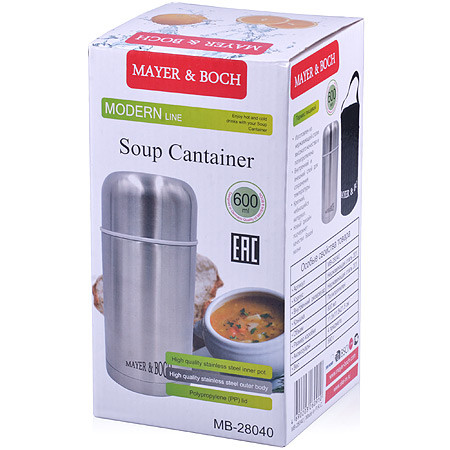 Mayer & Boch Термос с чехлом-сумкой (600 мл)В данный момент этот товар отсутствует в продаже. Возможно, у нас найдется аналогичный или похожий товар здесь. Термос с чехлом выполнен из качественной нержавеющей стали, которая не вступает в реакцию с содержимым термоса и не изменяет вкусовых качеств напитка. Двойная стенка из нержавеющей стали сохраняет температуру на срок до 6-ти часов. Вакуумный закручивающийся клапан предохраняет от проливаний. Данная модель термоса прочная, долговечная и в тоже время легкая. Стильный металлический термос понравится абсолютно всем и впишется в любой интерьер кухни. Легко и просто моется. |
