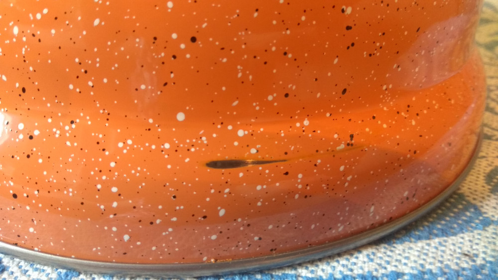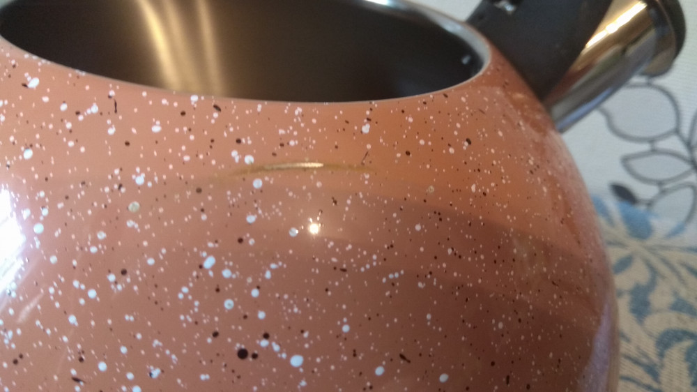 Чайник через три месяца эксплуатации) краска слезла. да и вообще достоинство этого чайника, лишь громкий свисток. Сталь очень тонкая и сверху не эмаль, а какая-то краска. ещё при покупке были царапины, а во время ухода слезла и остальная краска(
