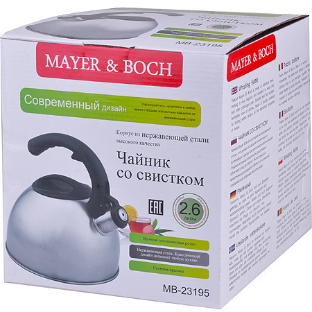 Mayer & Boch Чайник со свистком (2,6 л)В данный момент этот товар отсутствует в продаже. Возможно, у нас найдется аналогичный или похожий товар здесь. Чайник изготовлен из высококачественной нержавеющей стали. Изделия из нержавеющей стали не окисляются и не впитывают запахи, благодаря чему вы всегда получите натуральный, насыщенный вкус и аромат напитков. Капсулированное дно с прослойкой из алюминия обеспечивает наилучшее распределение тепла. Удобная фиксированная ручка выполнена из бакелита, также на ручке расположена клавиша механизма открывания носика. Носик чайника оснащен насадкой-свистком, который позволяет контролировать процесс кипячения или подогрева воды. Поверхность чайника гладкая, что облегчает уход за ним. Эстетичный и функциональный, с современным дизайном, чайник будет оригинально смотреться на любой кухне. Подходит для использования на всех типах плит, кроме индукционных. Подходит для мытья в посудомоечной машине. |