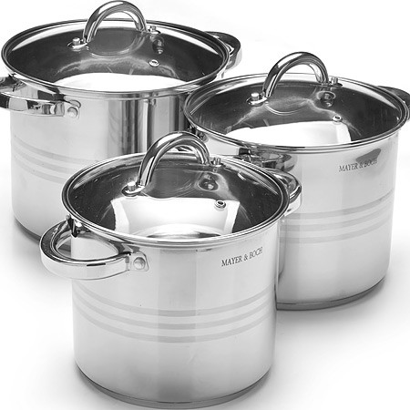Набор посуды Mayer&Boch выполнен из высококачественной нержавеющей пищевой стали с зеркальной внешней поверхностью. Внутренняя поверхность идеально ровная, что значительно облегчает мытье. Крышки, выполненные из термостойкого стекла, имеют отверстие паровыпуска и металлический обод. Крышки плотно прилегают к краям посуды, предотвращая проливание жидкости и сохраняя аромат блюд. Также изделия снабжены эргономичными стальными ручками.