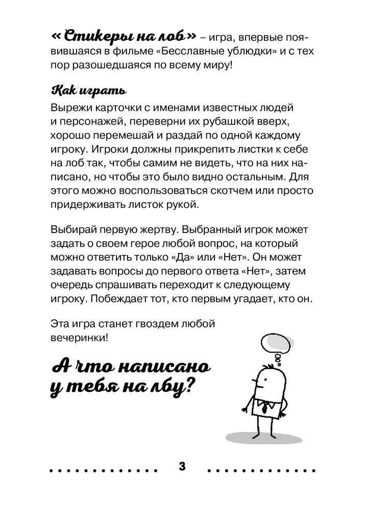 Сыграем в «Стокеры на лоб!»В данный момент этот товар отсутствует в продаже. Возможно, у нас найдется аналогичный или похожий товар здесь. Серия: Игра в кармане. Зажигай с друзьями! Перед вами — та самая игра с листочками на лбу из фильма «Бесславные ублюдки», завоевавшая популярность во всем мире! Суть ее проста: каждый игрок клеит себе на лоб стикер с именем известного человека или персонажа таким образом, чтобы он сам не видел, что написано у него на лбу, но чтобы это было видно остальным. Задача — отгадать своего персонажа, задавая наводящие вопросы другим игрокам. Веселая, азартная и невероятно увлекательная, эта игра станет гвоздем любой вечеринки. Гарантируем, вы не заметите, как пролетит время! |