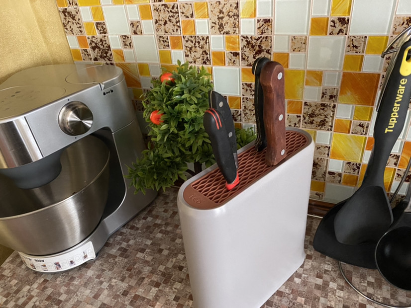 Подставка выглядит просто и изысканно. Ножей помещается много. Глубина (минимальная) и ширина экономят место на кухонной рабочей поверхности. Бонус: серая вставка-держатель (на фото) не только легко снимается и чистится, но и может быть заменена на розовую (внутри вставки из обоих серого и розового цветов). Традиционная деревянная подставка стояла возле раковины и от влаги начала плесневеть, к тому же была очень тяжелой. Новая подставка абсолютно гигиенична, гораздо легче прежней и при этом устойчивая.
