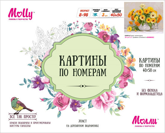 Molly Набор для раскрашивания по номерам «Букет календулы» (40×50 см)В данный момент этот товар отсутствует в продаже. Возможно, у нас найдется аналогичный или похожий товар здесь. Серия: Картины по номерам Используя набор для рисования, можно нарисовать ярко-жёлтый букет календулы в белой вазе. Для рисования не требуется специальных навыков и способностей, достаточно иметь огромное желание рисовать. Нумерация на холсте выступает в роли инструкции по рисованию. Защитить готовую картину от воздействия ультрафиолетовых лучей и влаги поможет акриловый лак в наборе. Перед использованием его необходимо разбавить водой в соотношении 1:1. Лак следует наносить на краску в качестве финишного покрытия. |