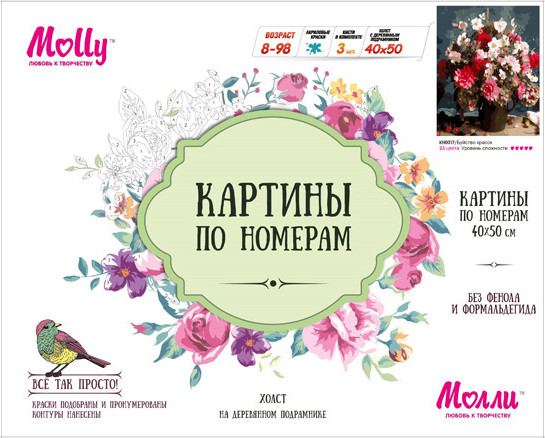 Molly Набор для раскрашивания по номерам «Буйство красок» (40×50 см)В данный момент этот товар отсутствует в продаже. Возможно, у нас найдется аналогичный или похожий товар здесь. Серия: Картины по номерам Используя кисти и краски и следуя подробной нумерации, можно нарисовать картину с изображением яркого букета из разноцветных цветов в вазе. Готовая картина, помещенная в раму, украсит любой интерьер. Покрытие из акрилового лака позволит надолго сохранить насыщенные цвета картины. |