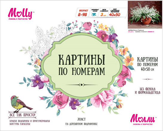 Molly Набор для раскрашивания по номерам «Бузин. Ландыши» (40×50 см)В данный момент этот товар отсутствует в продаже. Возможно, у нас найдется аналогичный или похожий товар здесь. Серия: Картины по номерам Защитить готовую картину от воздействия ультрафиолетовых лучей и влаги поможет акриловый лак в наборе. Перед использованием его необходимо разбавить водой в соотношении 1:1. Лак следует наносить на краску в качестве финишного покрытия. |
