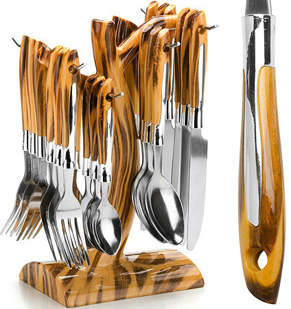 Прекрасное сочетание свежего дизайна и удобство использования предметов набора придется по душе каждому. Предметы набора расположены на подставке, стилизованной под дерево, с секциями для каждого вида приборов.