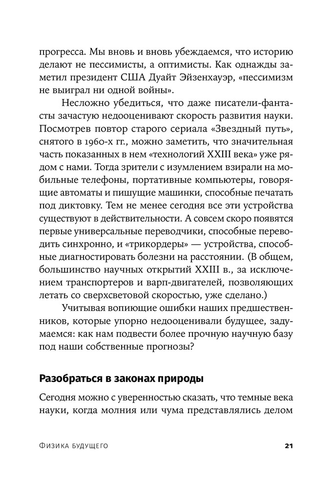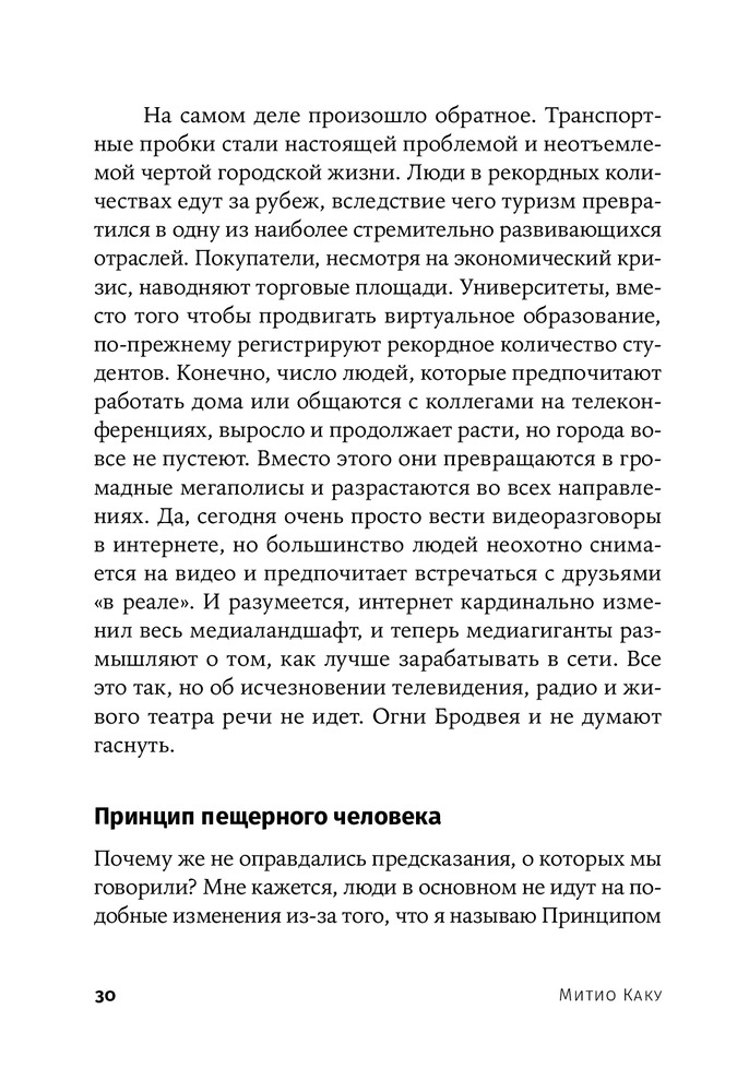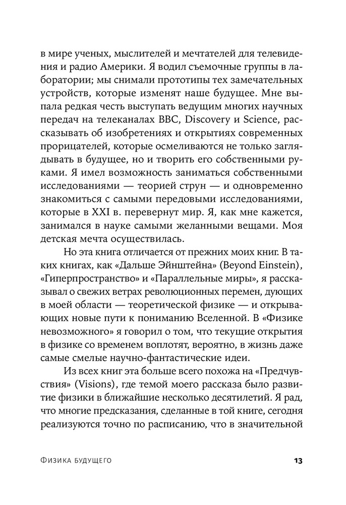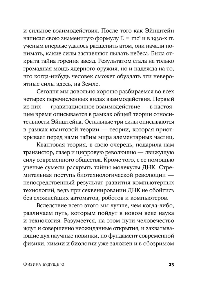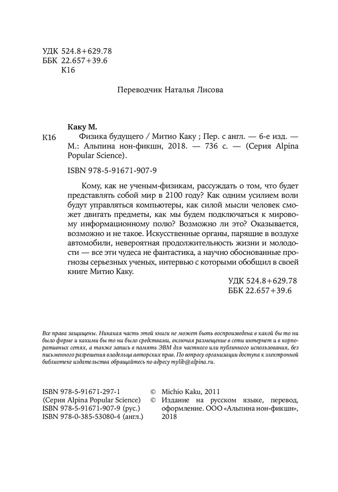 Физика будущегоВ данный момент этот товар отсутствует в продаже. Возможно, у нас найдется аналогичный или похожий товар здесь. Серия: Alpina. Popular Science Кому, как не ученым-физикам, рассуждать о том, что будет представлять собой мир в 2100 году? Как одним усилием воли будут управляться компьютеры, как силой мысли человек сможет двигать предметы, как мы будем подключаться к мировому информационному полю? Возможно ли это? Оказывается, возможно и не такое. Искусственные органы, парящие в воздухе автомобили, невероятная продолжительность жизни и молодости — все эти чудеса не фантастика, а научно обоснованные прогнозы серьезных ученых, интервью с которыми обобщил в своей книге Митио Каку. |