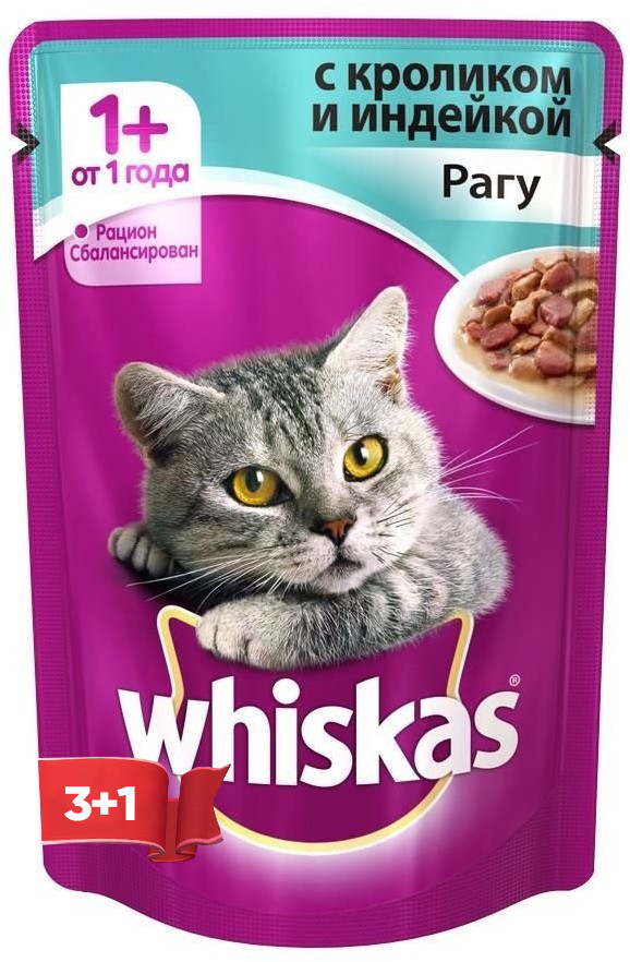 Вся линейка в паучах Whiskas проверена нашими питомцами и всегда они довольны не зависимо какой состав с курицей, рыбой или говядиной. А с такой акцией как 3+1 корм особенно нас как владельцев питомцев оооочень радует, почаще бы были такие акции. спасибо магазину. будем ждать.