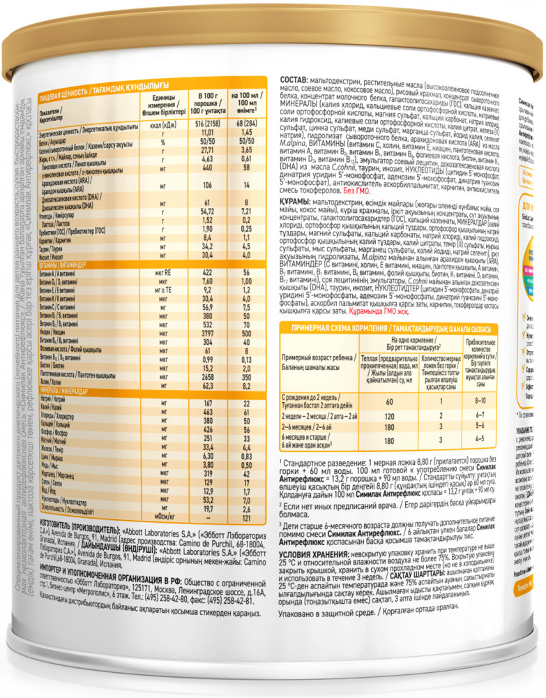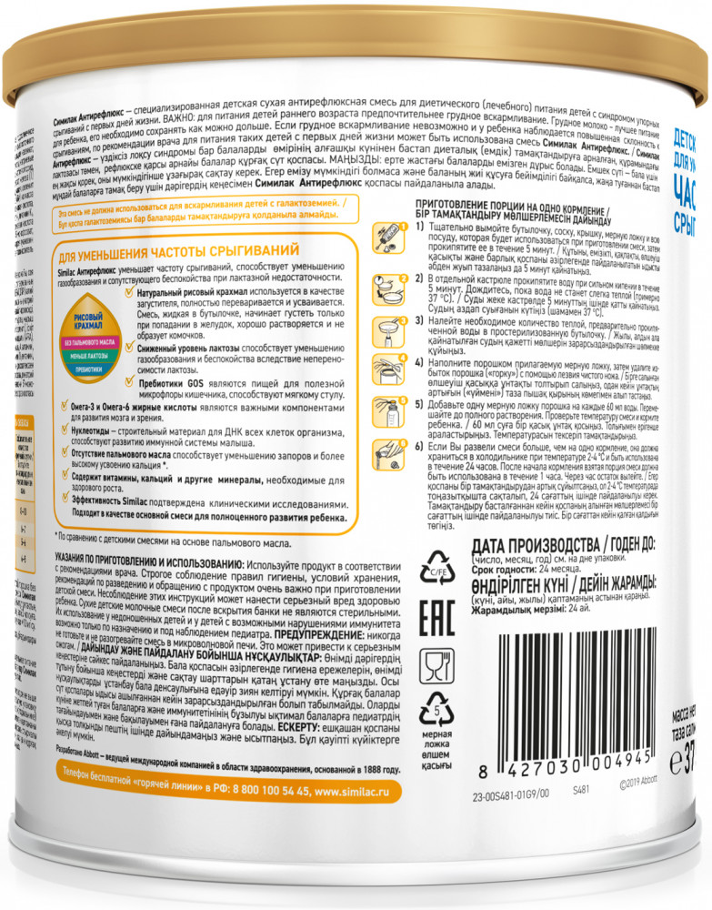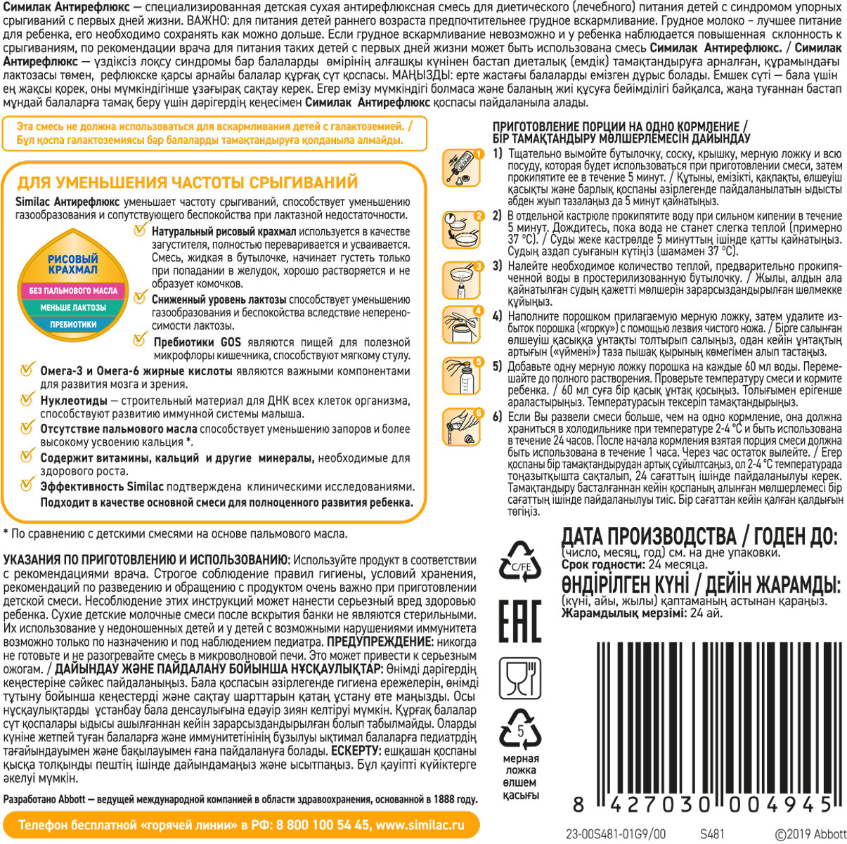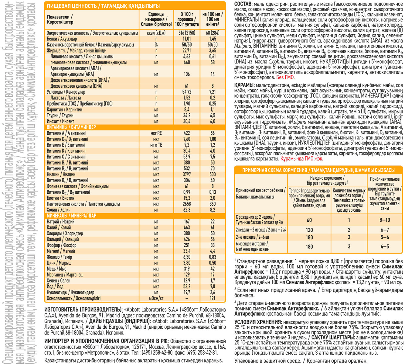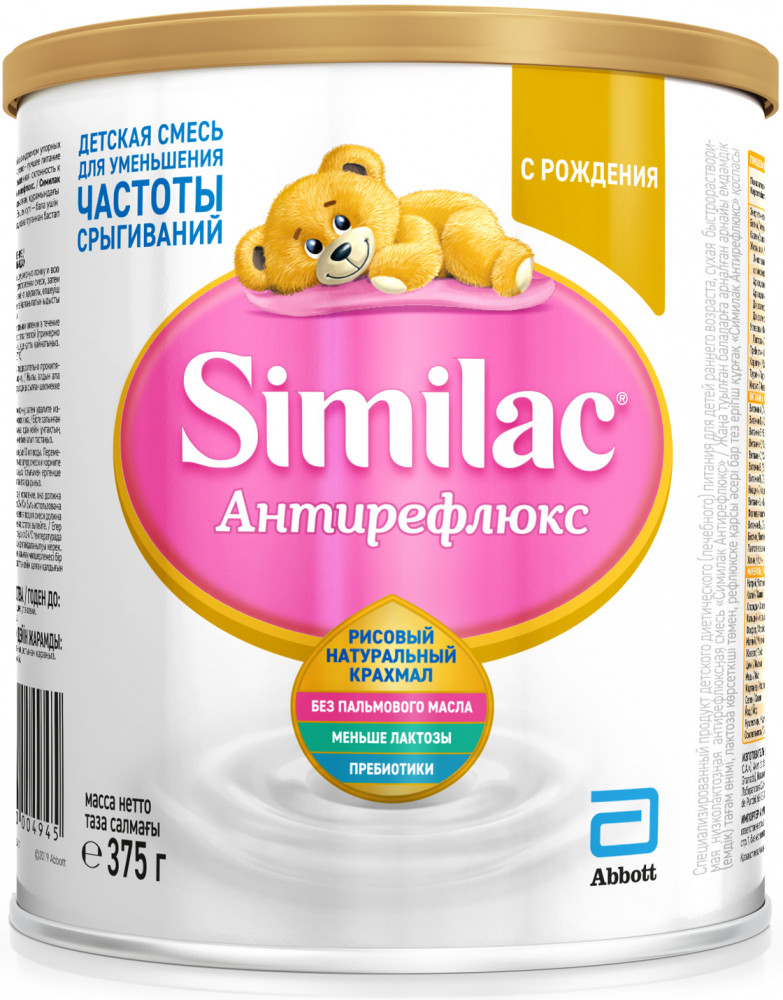Специализированная детская сухая низколактозная антирефлюксная смесь для комфортного пищеварения детей со срыгиваниями. Предназначена для детей с рождения. Данная смесь не должна использоваться для вскармливания детей с галактоземией. Рисовый крахмал в качестве загустителя начинает густеть только при попадании в желудок. Смесь легко проходит через соску. Хорошо переносится. Полностью переваривается. Отсутствие пальмового масла клинически показано, что Симилак без пальмового масла уменьшает срыгивания.Смесь легко проходит через соску, способствует более высокому усвоению кальция, более высокой минерализации костной ткани. Низкий уровень лактозы способствует уменьшению срыгиваний, способствует уменьшению газообразования, вздутия и беспокойства вследствие непереносимости лактозы. Содержит специальный комплекс для комфортного пищеварения. Меньше лактозы, пребиотики, отсутствие пальмового масла. Рекомендована детям на искусственном вскармливании в качестве основной смеси. При сочетании срыгиваний и симптомов лактозной недостаточности: жидкого стула и вздутия. Как симптоматическая коррекция срыгиваний у ребенка, перенесшего гипоксию.