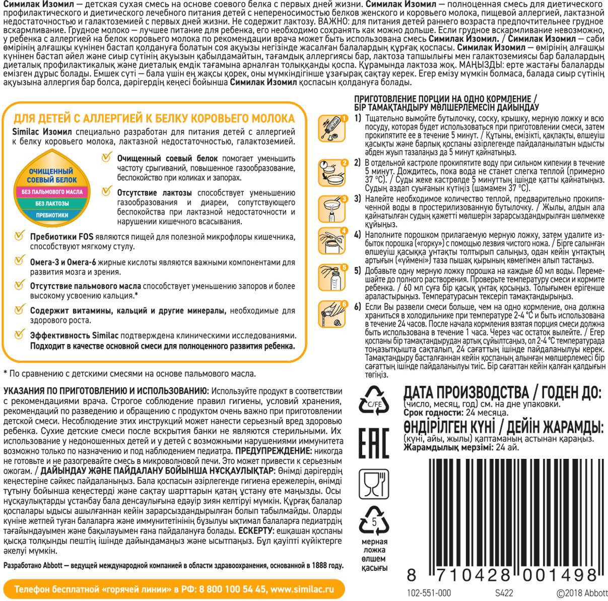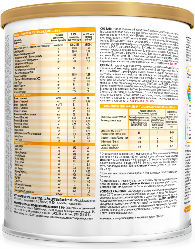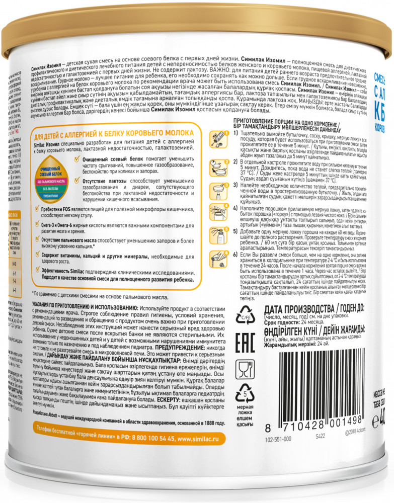 Similac Сухая смесь специализированная «Изомил на основе белков сои»В данный момент этот товар отсутствует в продаже. Возможно, у нас найдется аналогичный или похожий товар здесь. Полноценная смесь на основе изолята белков сои для лечебного и профилактического питания детей с аллергией к белку коровьего молока, с непереносимостью лактозы, галактоземией и при лечении диареи с первых дней жизни. Не содержит лактозу, обогащен питательными веществами, подобными содержащимся в грудном молоке. |