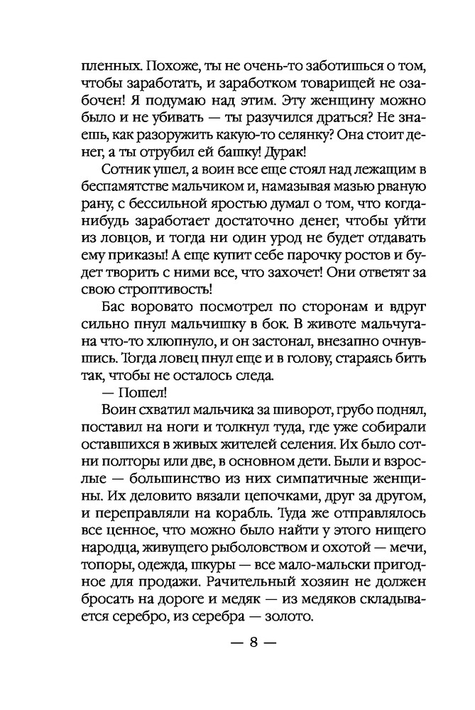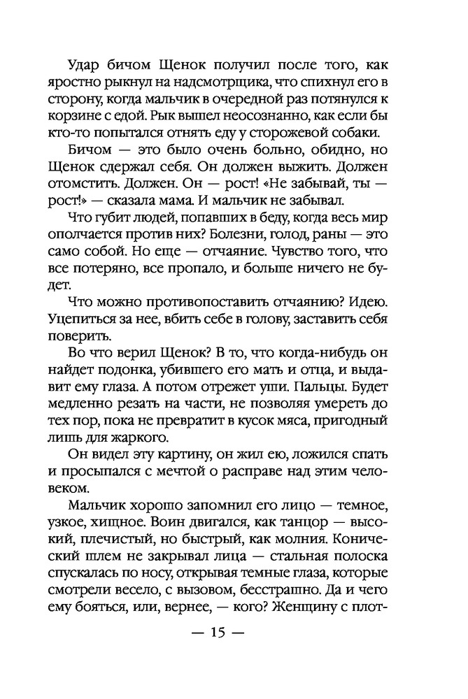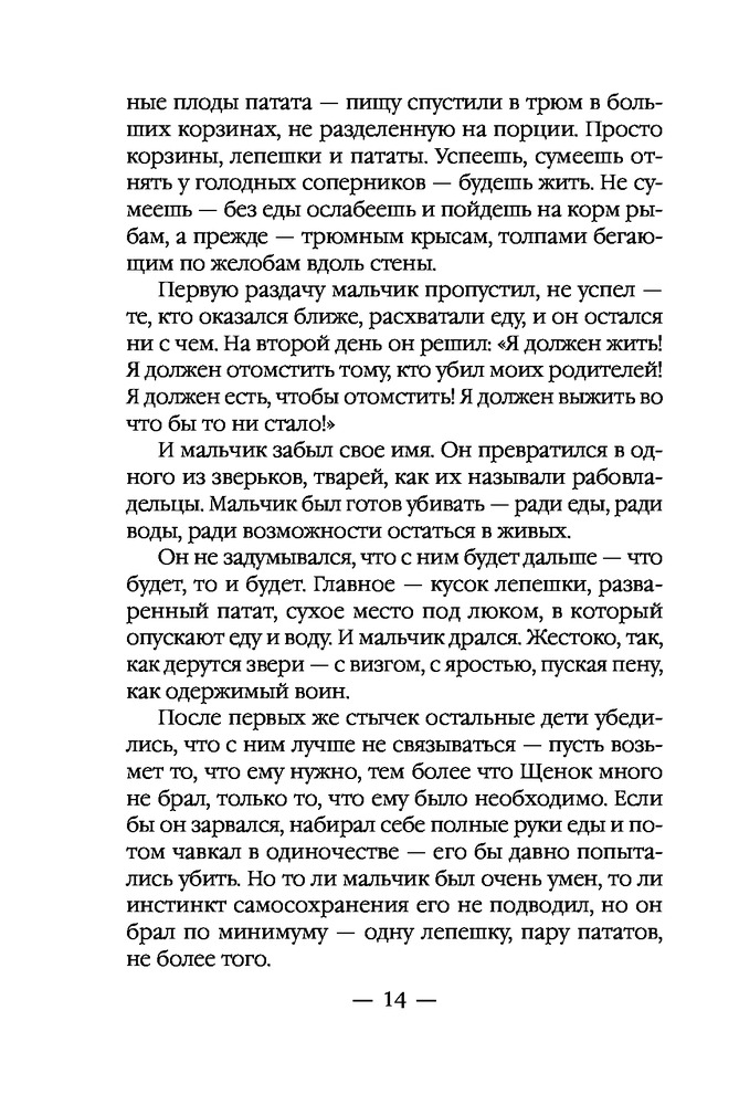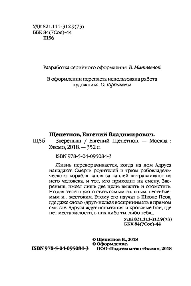 ЗверенышВ данный момент этот товар отсутствует в продаже. Возможно, у нас найдется аналогичный или похожий товар здесь. Серия: Новый фантастический боевик (обложка) Жизнь переворачивается, когда на дом Адруса нападают. Смерть родителей и трюм рабовладельческого корабля капля за каплей вытравливают из него человека, и тот, кто приходит на смену, Звереныш, имеет лишь две цели: выжить и отомстить. Но для этого нужно стать самым сильным, несгибаемым и... жестоким. Этому его научат в Школе Псов, где даже слово «друг» нельзя воспринимать в прямом смысле. Адруса ждут испытания и кровавые бои, где нет места жалости, в них либо ты, либо тебя... |