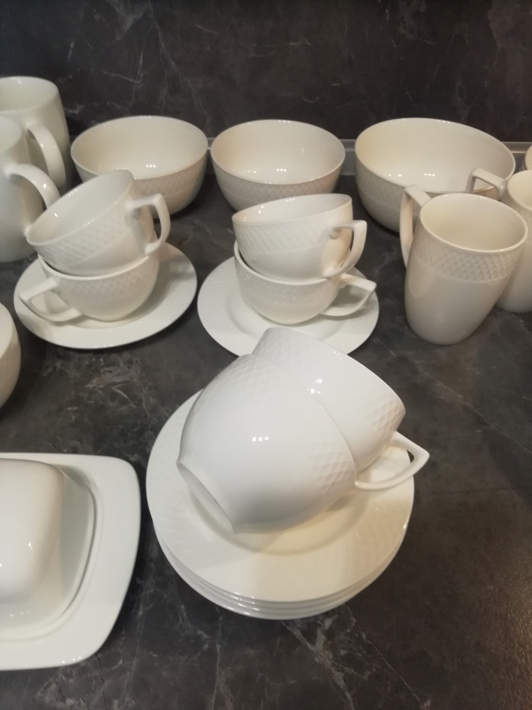 Купила весь сервиз 6 таких тарелок, 6 суповых, 6 десертных, чайный сервиз 6 пар, 2 салатника 14 см, 1 салатник 16 см, 2 кружки 350 мл, чайник, сахарница, молочник. Всё это серии Юлия Высоцкой. Ещё добавила серию fine 4 кружки 460 мл, 4 пирожковых тарелки 15 см, 3 чашки для мюсли и масленку. Получилось очень красиво.