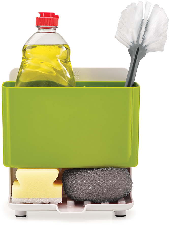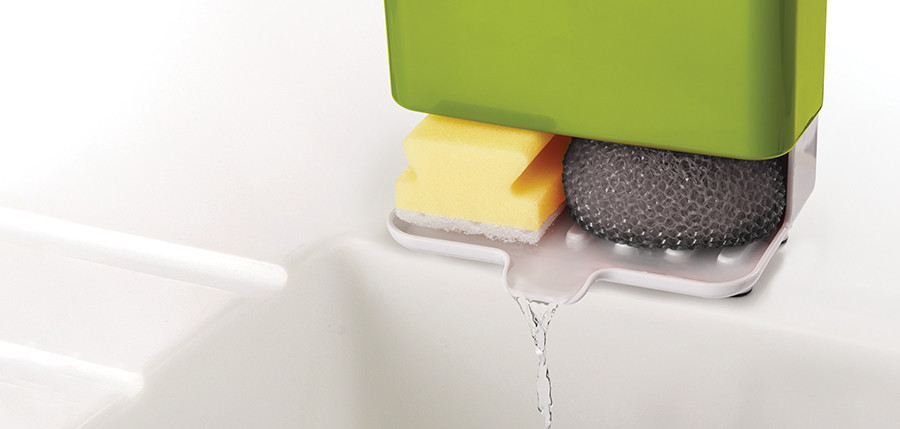 Органайзер экономит место, а открытое основание и слив в раковину обеспечивают чистоту и гигиеничность использования. В органайзере есть отделения для щётки, моющего средства и губок. Его также можно разобрать для дополнительной очистки.