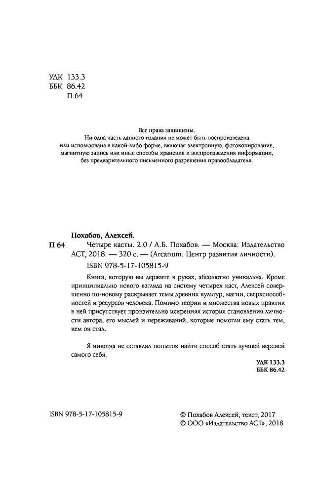 💳 Оплатить за товар можно при получении 🇰🇿 Есть бесплатная доставка по Казахстану от 1 дня 🎁 Копите бонусы с каждой покупки Серия: Arcanum. Центр развития личности Сверхспособность Алексея Похабова — это умение объяснять. Даже сложнейшие механизмы магических практик он может разъяснить простым и доступным языком. Все, что описано в этой книге, проникает прямо в сознание и разрушает старые картины мира. И на новой почве вы сможете открыть в себе новые навыки, которые мир будет считать даром. В этой книге собрана самая основополагающая информация: |