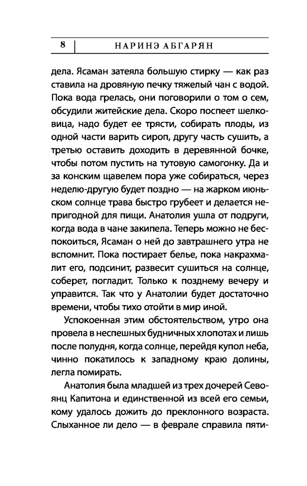 Книга мне очень понравилась! С одной стороны это короткие истории, но каждая дополняет общую картину. И в целом мы проживаем жизнь нескольких поколений маленькой армянской деревеньки, затерянной высоко в горах.