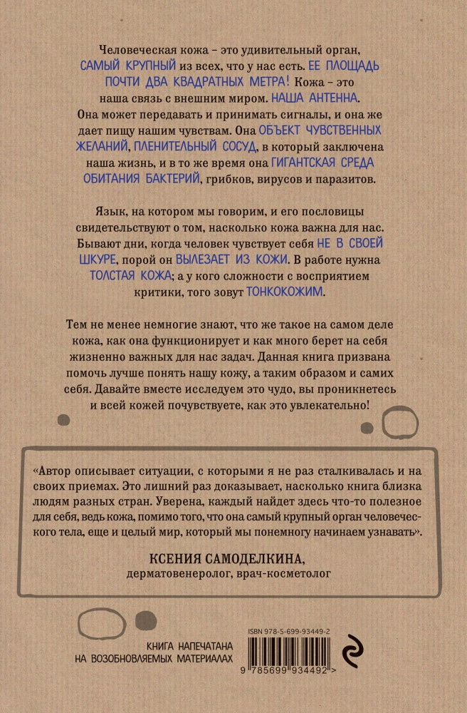 Человеческая кожа — удивительный орган, самый крупный из всех, что у нас есть. Ее площадь почти два квадратных метра! Кожа — это наша антенна. Она может передавать и принимать сигналы и дает пищу нашим чувствам. Это объект чувственных желаний, пленительный сосуд, в который заключена наша жизнь, и в то же время — гигантская среда обитания бактерий, грибков, вирусов и паразитов. Немногие знают, что же такое кожа на самом деле, как она функционирует и как много берет на себя жизненно важных для нас задач. Эта книга призвана помочь лучше понять нашу кожу, а таким образом и самих себя. Вы проникнетесь и всей кожей почувствуете, как это увлекательно! |