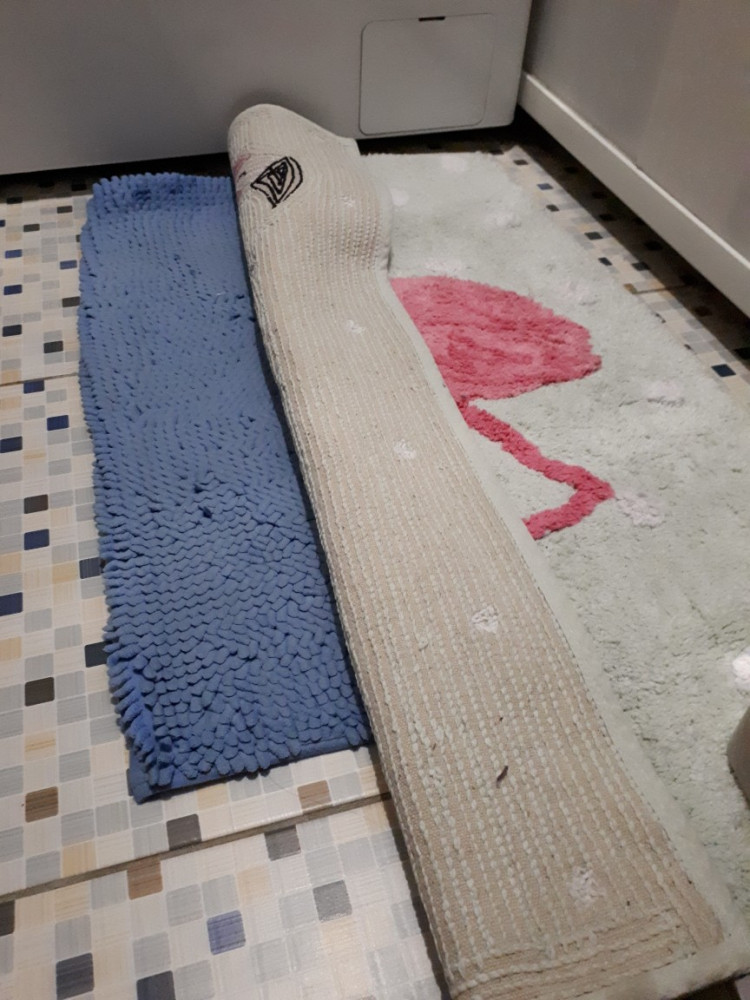выложила фото смотрите. поставила оценку 5 только за счет качества. супер мягкий такой как я и хотела. минус в том, что на моем кафеле он скользит, о чем я и думала конечно. Пока положила на старый коврик. скорее я немного пошаманю отрежу со старого ткань которая нескользящая и пришью к новому.