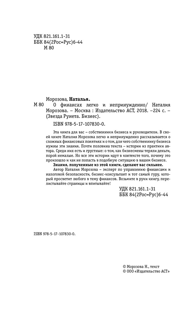 О финансах легко и непринужденноВ данный момент этот товар отсутствует в продаже. Возможно, у нас найдется аналогичный или похожий товар здесь. Серия: Звезда Рунета. Бизнес Эта книга для вас − собственники бизнеса и руководители. В своей книге Наталия Морозова легко и непринужденно рассказывается о сложных финансовых понятиях и о том, для чего собственнику бизнеса нужны эти знания. |