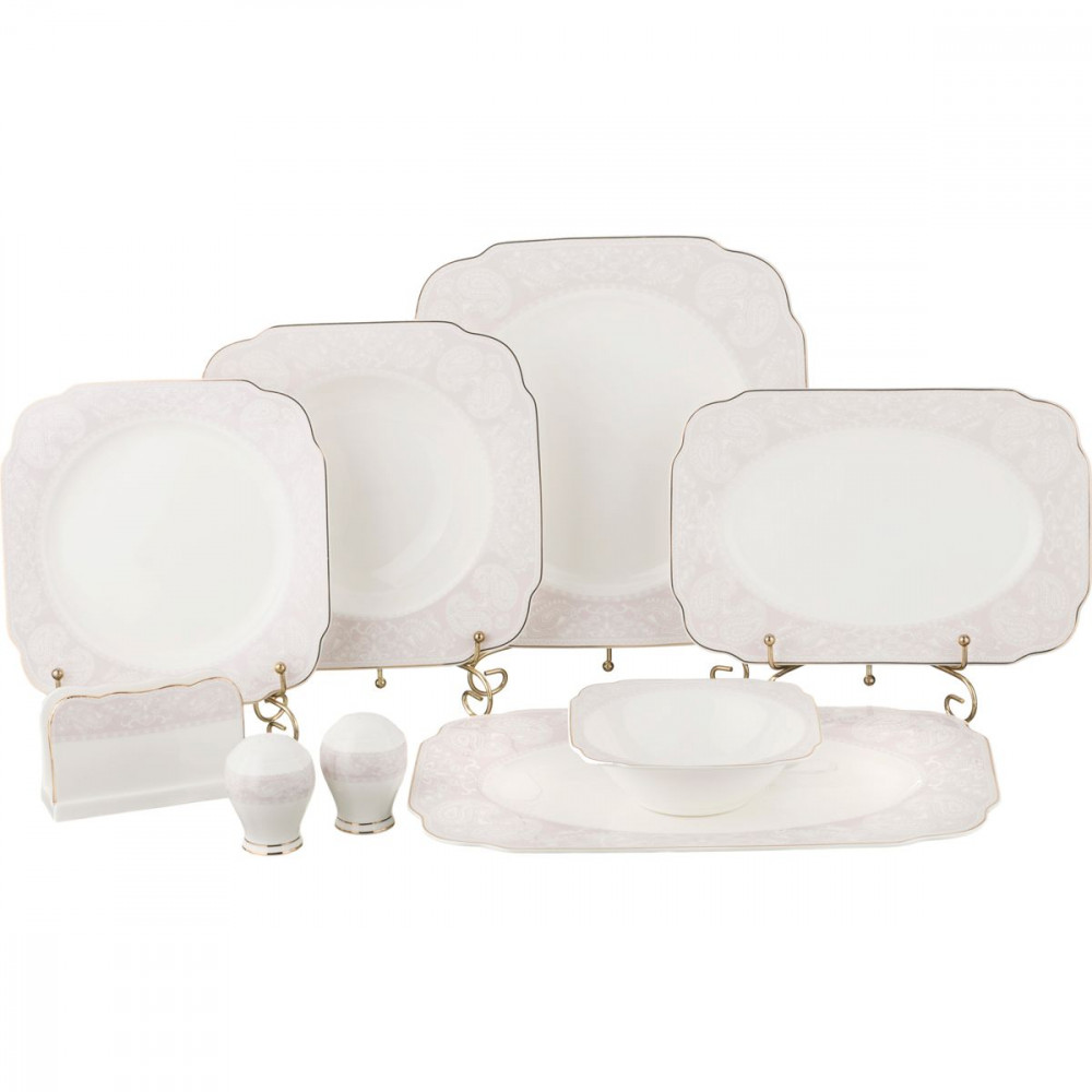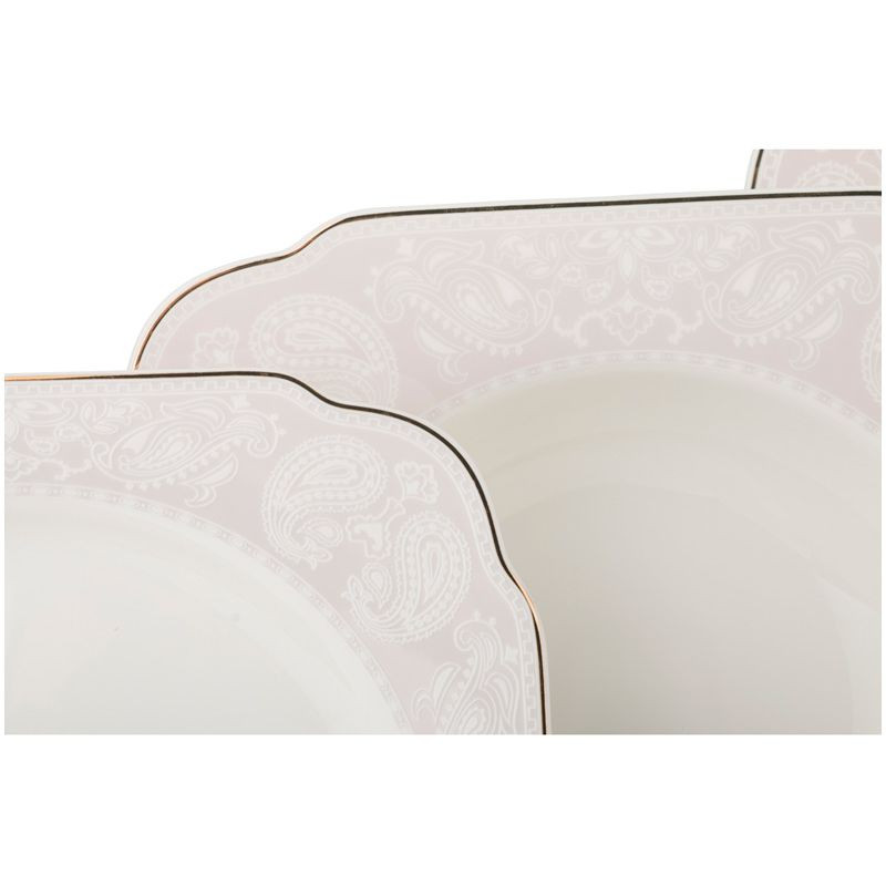 Очень красивый сервиз! Тонкий, невесомый, белоснежный фарфор с классическим рисунком пейсли на бледно- сиреневой или бледно- розовой кайме! Кстати, в этот раз цвет соответствует фото на сайте. Флип угодил по всем статьям, спасибо! Форма у тарелок квадратная с красивыми изгибами. Ещё раз спасибо!