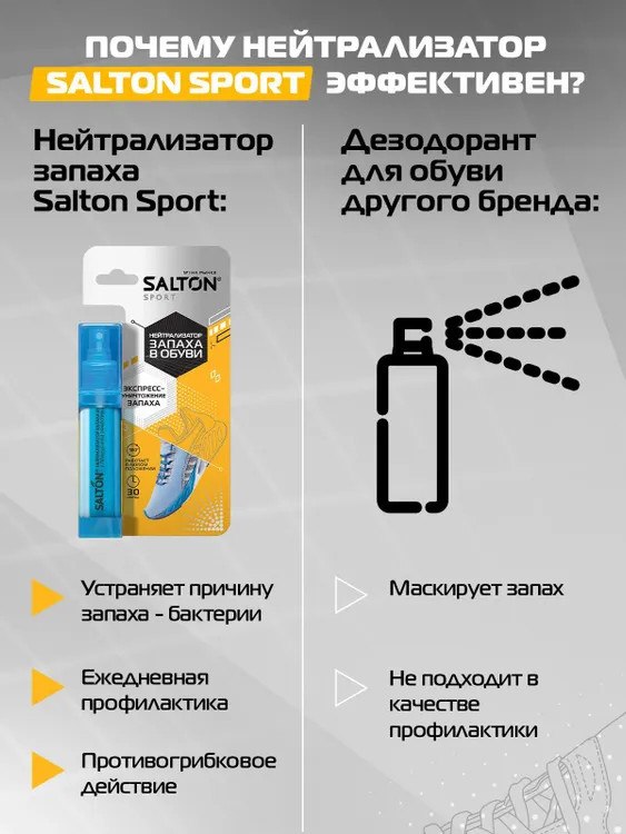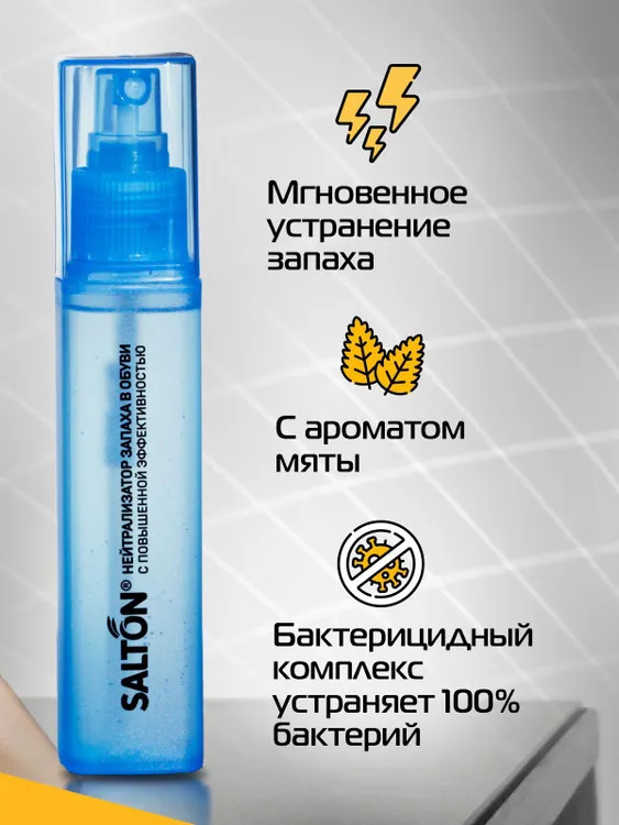 Salton Нейтрализатор запаха в обуви «Sport»нейтрализует запах эффективен удовлетворяет ожидания подходит для длительного ношения кратковременный эффект В данный момент этот товар отсутствует в продаже. Возможно, у нас найдется аналогичный или похожий товар здесь. Частая неприятная проблема при интенсивных физических нагрузках — это неприятный запах. В отличие от обычного дезодоранта для обуви, нейтрализатор запаха SALTON Sport не маскирует неприятный запах, а мгновенно устраняет причину его возникновения бактерии, а еще защищает кожу стоп и ногти от опасности возникновения грибковых заболеваний. |