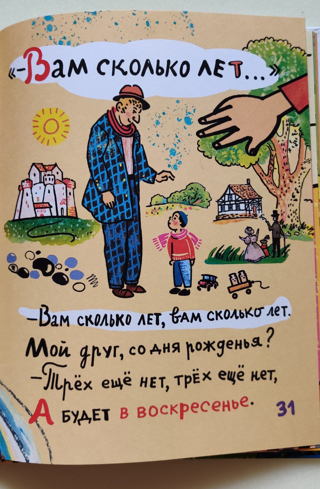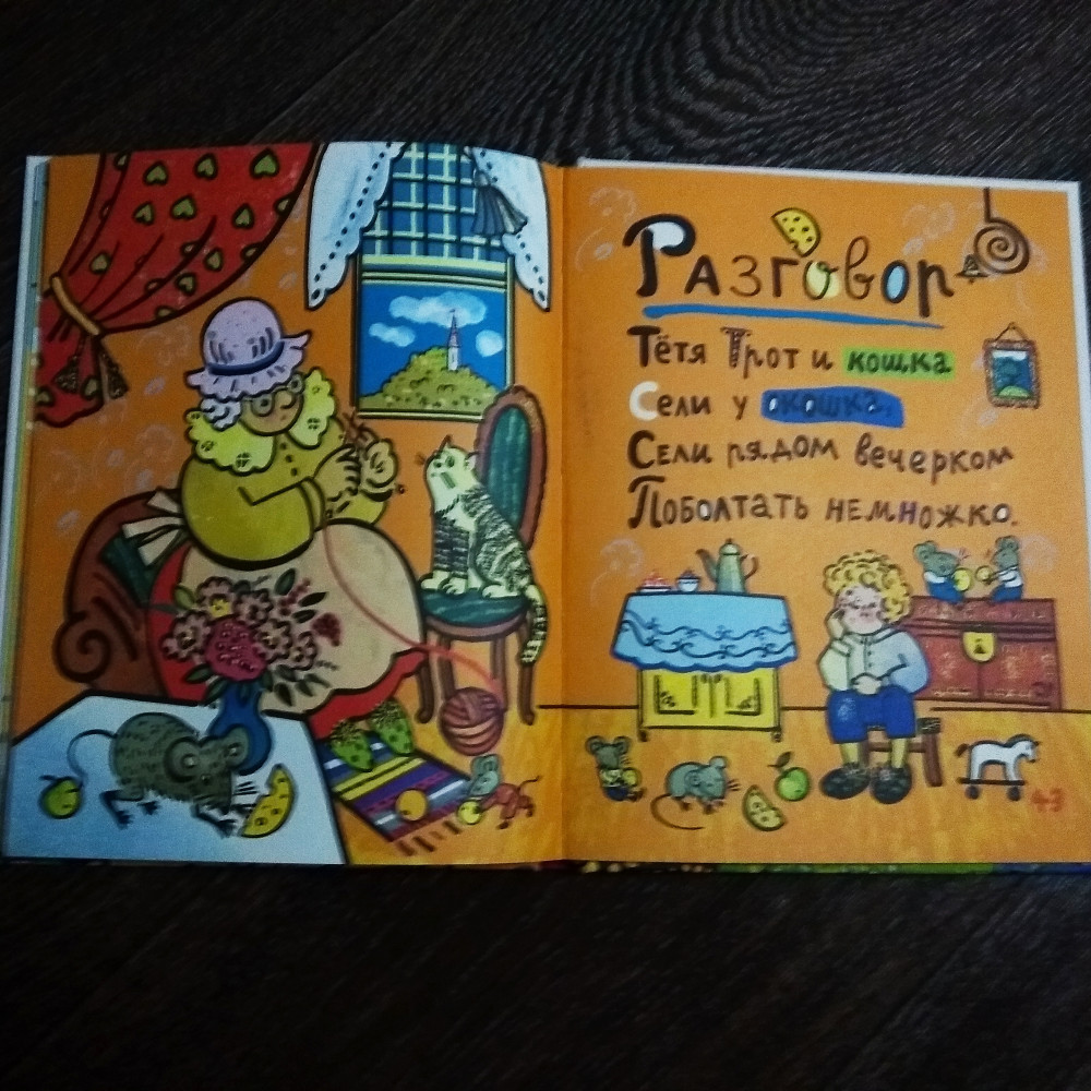 Очень веселенькая книга. Полностью иллюстрированная. Иллюстрации авторские, своеобразные, яркие. Аж в глазах рябит! :) На каждой странице короткие стишки-потешки для самых маленьких. Страницы - плотная бумага, матовая.