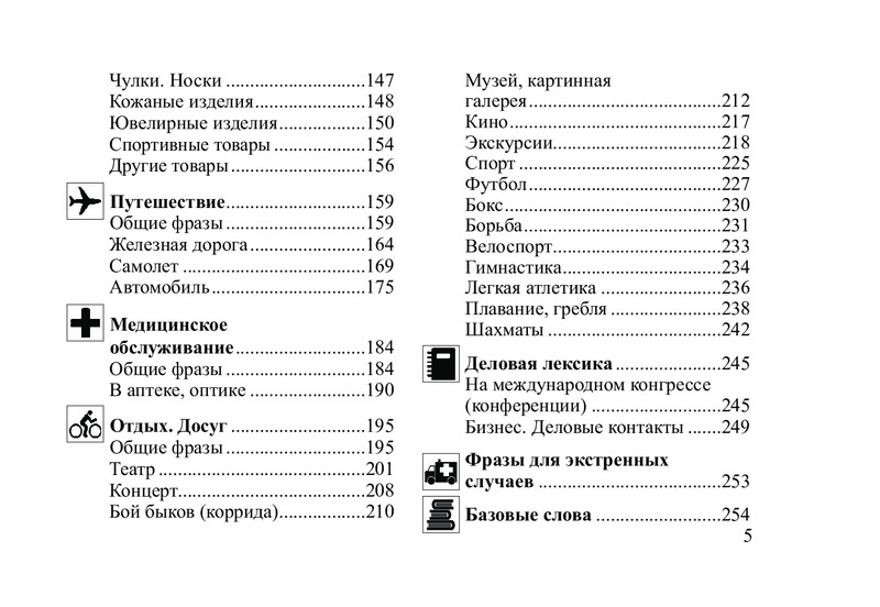 Русско-испанский разговорникВ данный момент этот товар отсутствует в продаже. Возможно, у нас найдется аналогичный или похожий товар здесь. Серия: Слово в кармане Разговорник содержит наиболее употребительные слова и выражения, которые могут использоваться в различных ситуациях путешествия, а также познавательную информацию о стране. Материал подобран и сгруппирован по тематическому принципу, что значительно облегчит пользование разговорником. Произношение испанских слов передано транслитерацией русскими буквами. Для широкого круга читателей. |