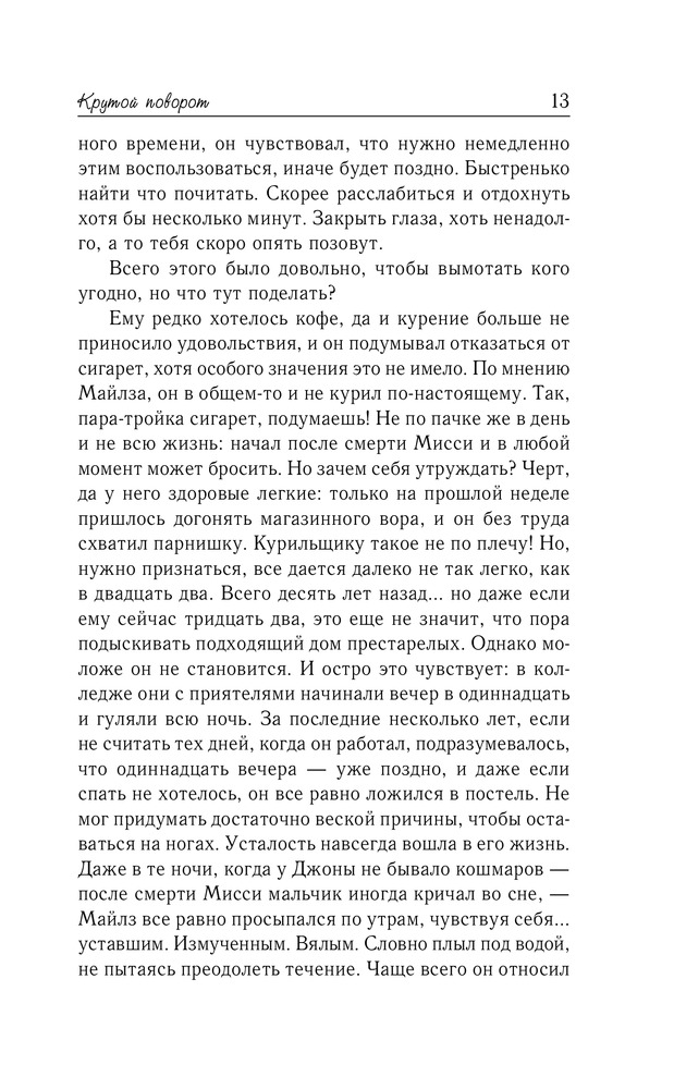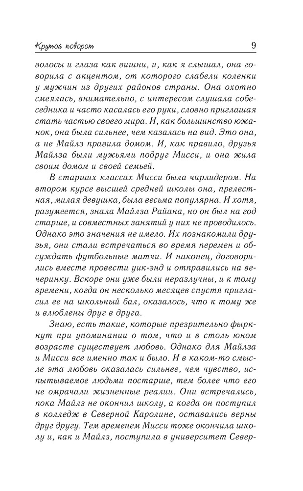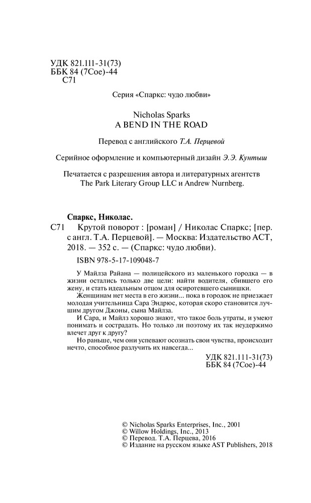 Крутой поворотВ данный момент этот товар отсутствует в продаже. Возможно, у нас найдется аналогичный или похожий товар здесь. Серия: Спаркс: чудо любви У Майлза Райана — полицейского из маленького городка — в жизни остались только две цели: найти водителя, сбившего его жену, и стать идеальным отцом для осиротевшего сынишки. Женщинам нет места в его жизни... пока в городок не приезжает молодая учительница Сара Эндрюс, которая скоро становится лучшим другом Джоны. И Сара, и Майлз прекрасно знают, что такое боль утраты, и умеют понимать и сострадать. Но только ли поэтому их так неудержимо влечет друг к другу? Но раньше, чем они успевают осознать свои чувства, происходит нечто, способное разлучить их навсегда... |