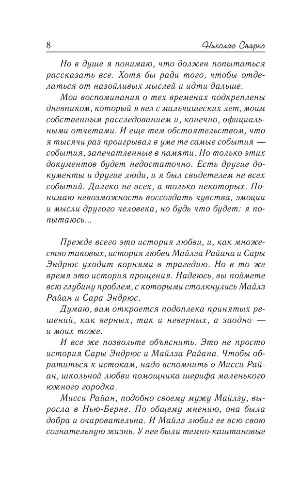 До конца переживала за события, как сложилась судьба Майлза и Мисси. И как страдал о потери матери. И как сводила судьба Майза и Сары. Красота и чистота Сары. Отчаяние Брайана сильно тронуло и конец так обрадовал, как они ждали Сару😭😭😊 Спасибо Никаласу за непредсказуемый роман. Спасибо издательству, спасибо flip.kz