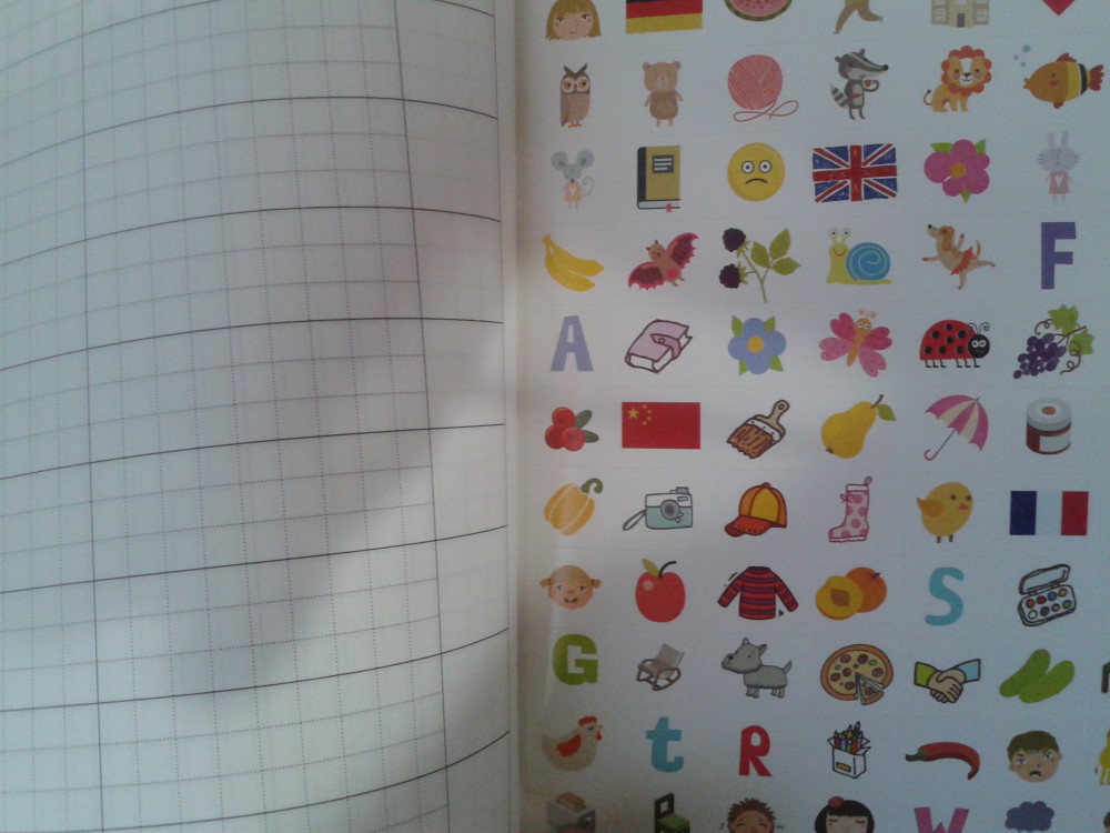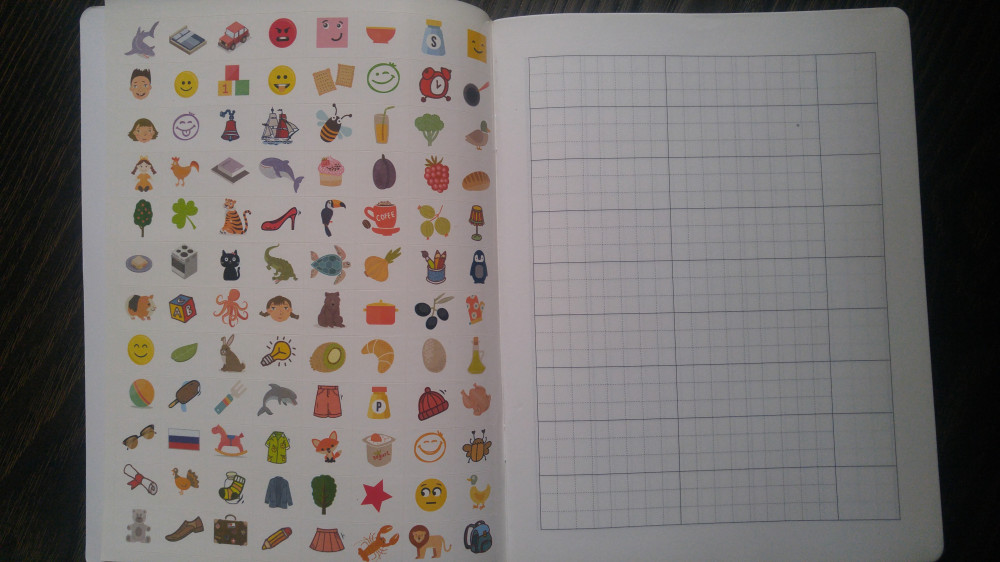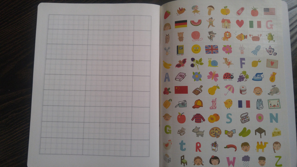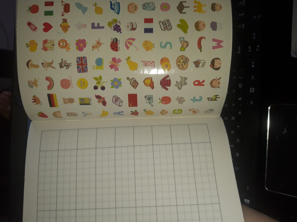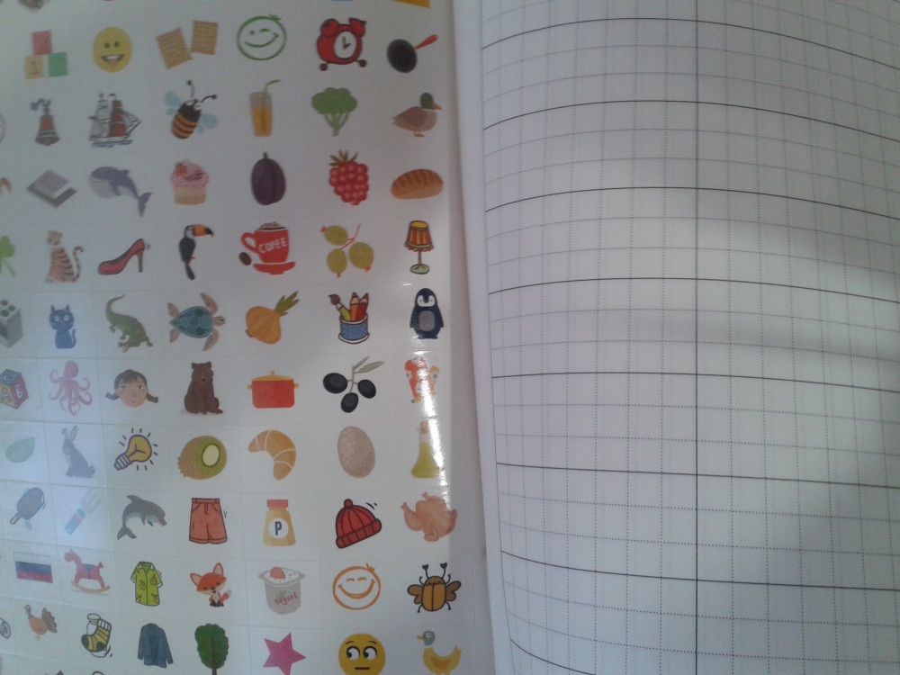 Крупные клеточки. Интересные наклейки. Доча прописывает слово и клеит наклейку. Ей интересно и заодно запоминает как пишется слово. Спасибо flip за разнообразный выбор!