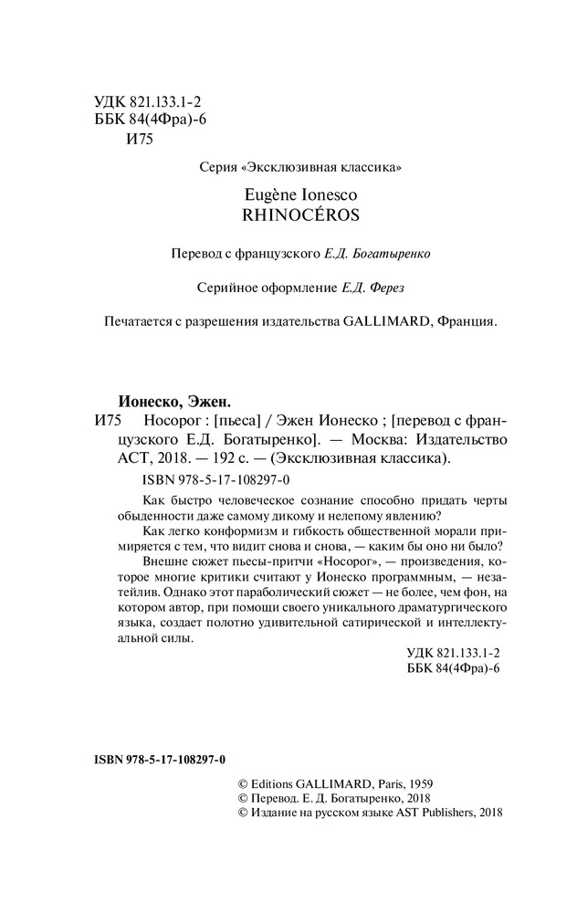 НосорогВ данный момент этот товар отсутствует в продаже. Возможно, у нас найдется аналогичный или похожий товар здесь. Серия: Эксклюзивная классика Как быстро человеческое сознание способно придать черты обыденности даже самому дикому и нелепому явлению? Как легко конформизм и гибкость общественной морали примиряется с тем, что видит снова и снова, — каким бы оно ни было? Внешне сюжет пьесы-притчи «Носорог» — произведения, которое многие критики считают у Ионеско программным, — незатейлив. Однако этот параболический сюжет — не более чем фон, на котором автор при помощи своего уникального драматургического языка создает полотно удивительной сатирической и интеллектуальной силы. |