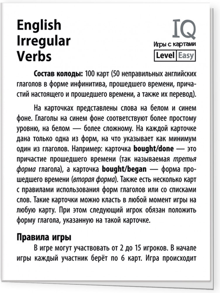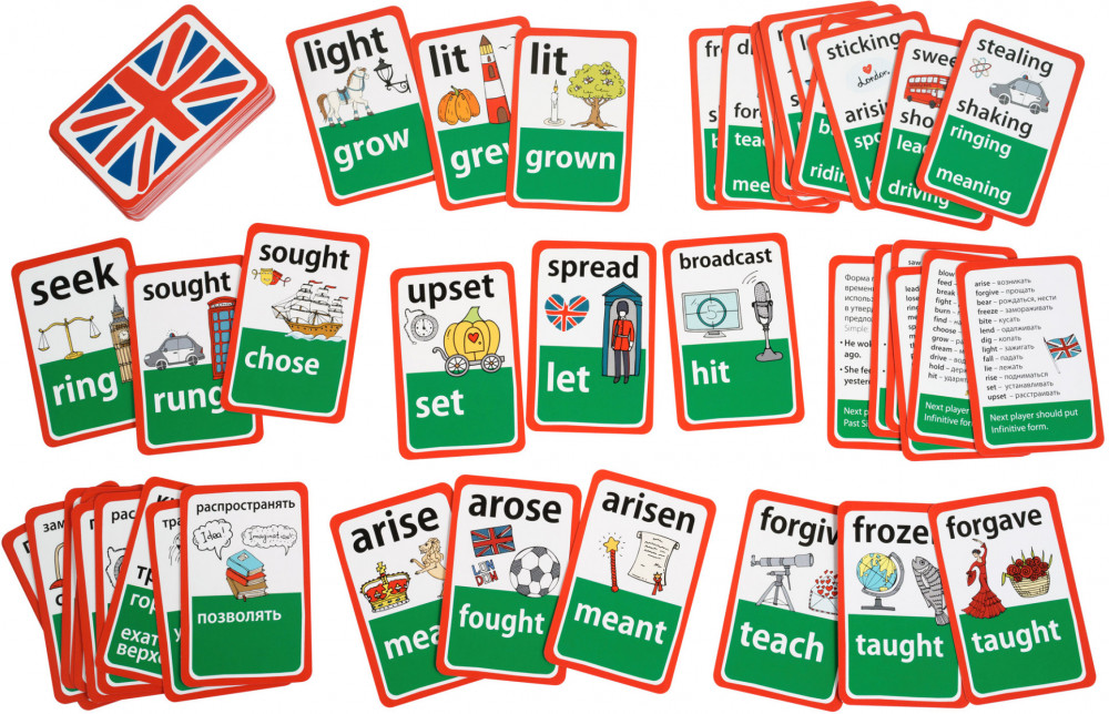 Умные игры с картами. Английские неправильные глаголы. Уровень 2высокое качество удобные карточки подходит для повторения дидактический материал непонятные правила В данный момент этот товар отсутствует в продаже. Возможно, у нас найдется аналогичный или похожий товар здесь. Взгляните на изучение глаголов по-новому вместе с «English Irregular Verbs». Это набор увлекательных игр для запоминания английских неправильных глаголов и причастий. Он поможет избежать нудной зубрежки и разнообразить учебный процесс. |