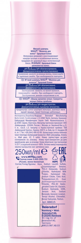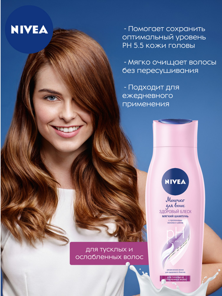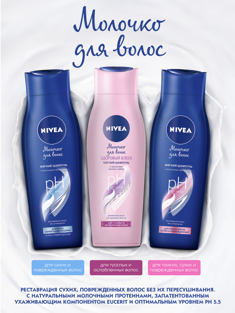 NIVEA Шампунь-уход для блеска волосВ данный момент этот товар отсутствует в продаже. Возможно, у нас найдется аналогичный или похожий товар здесь. Серия: Молочко для волос Более насыщенная формула с натуральными молочными протеинами и компонентом Eucerit. Концентрация активных компонентов подобрана в точном соответствии со структурой волос, поэтому волосы получают уход той интенсивности, которая им нужна, без утяжеления. |