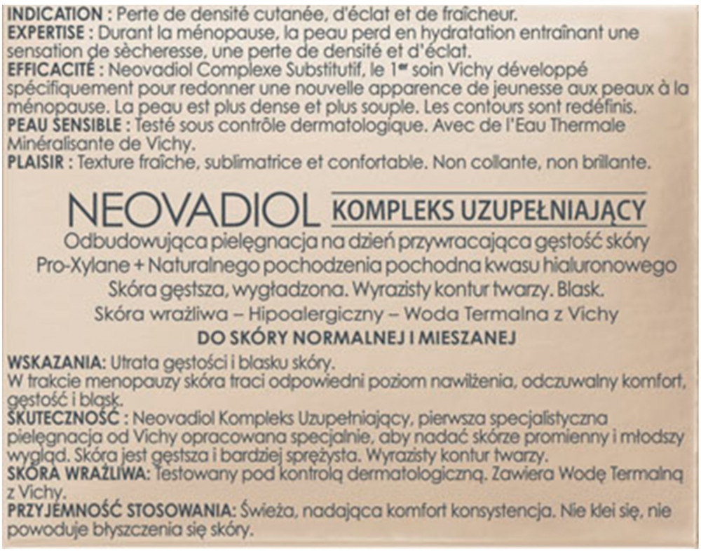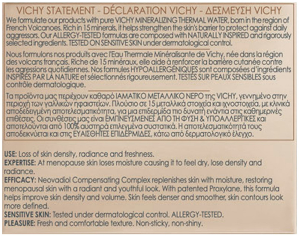 Vichy Крем-уход для нормальной и комбинированной кожи в период менопаузыВ данный момент этот товар отсутствует в продаже. Возможно, у нас найдется аналогичный или похожий товар здесь. Серия: Neovadiol В период менопаузы кожа испывает недостаток гормоны эстрогена, ответственный за выработку коллагена, от чего она становится менее упругой, черты лица менее очерченными, плывут уголки глаз и губ. Ко всему отмечается сухость кожи и ее дискомфорт. Эликсир интенсивно восполняет гидролипидный баланс кожи, доставляя кожи активные питательные компоненты глубоко в кожу. Формула эликсира обогащена Омега 3-6-9 жирными кислотами, входящие в состав таких масел, как сафлора, масло рисовых отрубей и масло карите. |