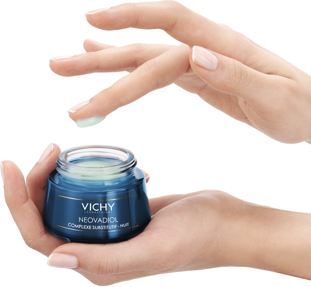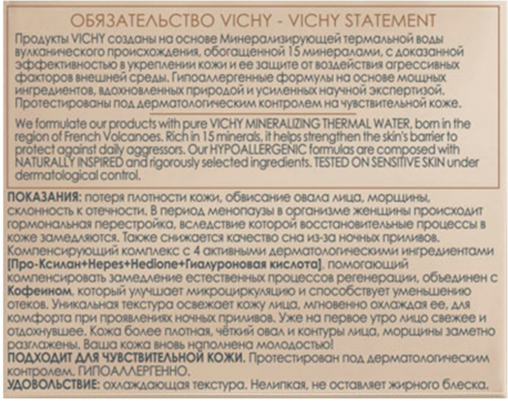 Vichy Крем-уход ночной в период менопаузыВ данный момент этот товар отсутствует в продаже. Возможно, у нас найдется аналогичный или похожий товар здесь. Серия: Neovadiol Vichy Neovadiol Complexe Substitutif Nuit помогает компенсировать видимые признаки старения кожи, которые особенно ярко проявляются в период менопаузы. Крем — уход действует ночью, когда запускаются естественные механизмы регенерации кожи. Его насыщенная инновационными компонентами формула стимулирует выработку коллагена, улучшает микроциркуляцию крови, делает кожу плотной, гладкой, упругой, а морщины — менее выраженными. Обновленная за ночь кожа утром выглядит свежей, подтянутой, овал лица становится более четким, тон кожи — ровным и здоровым. Крем-уход прошел дерматологические испытания и подходит для чувствительной кожи. |