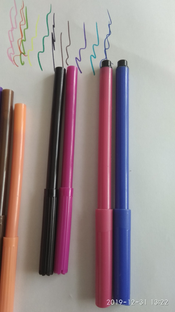 Очень тонкий корпус и некоторые кривые. Пишут ярко. Колпачок не удобно закрывать, криво входит. для сравнения фото с обычными фломастерами. Второй раз не куплю!