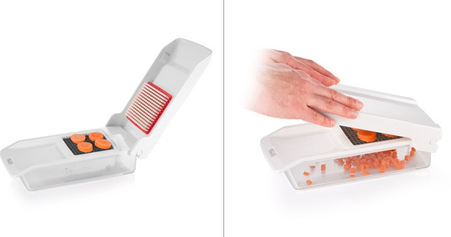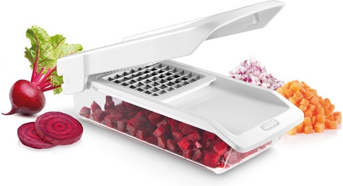 Отличная овощерезка! Подходит для сырых и варёных овощей. Качественная! Кубики получаются 2х размеров: 1. маленькие (5×5 мм) - для салатов и окрошки. 2. большие (1×1 см) -идеально для супа, овощных рагу и пр..