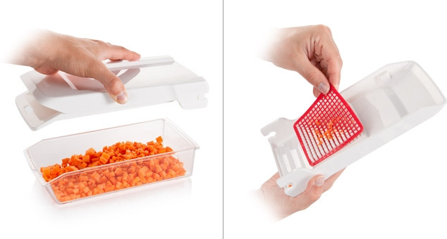 В целом овощерезкой довольна.Фиксируется, не скользит по столу. Контейнер хотелось бы побольше, чтобы не высыпать овощи без конца. Но самое главное насадки для резки! Одна слишком маленькая, другая очень крупная. Для своей семьи использую крупную, мои привыкли.Но для гостей хотелось бы кубики среднего размера