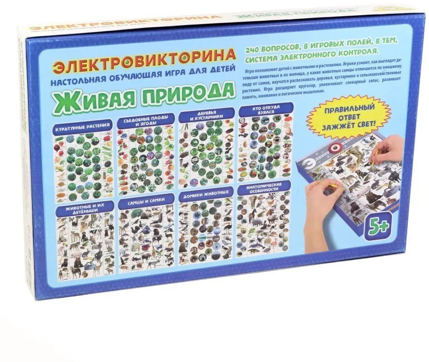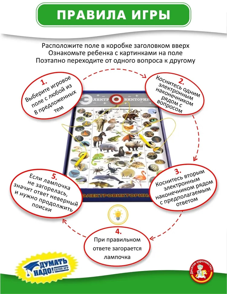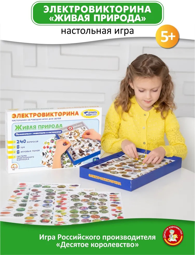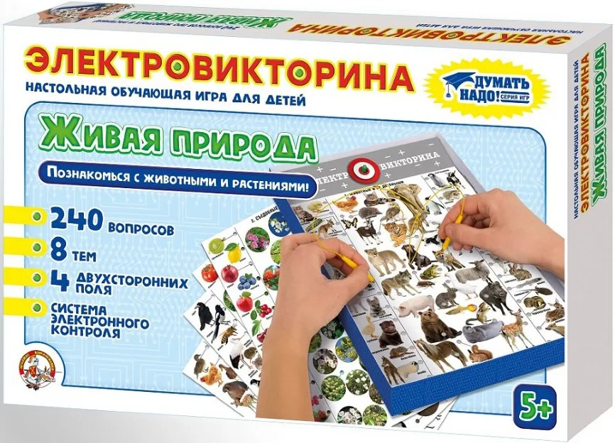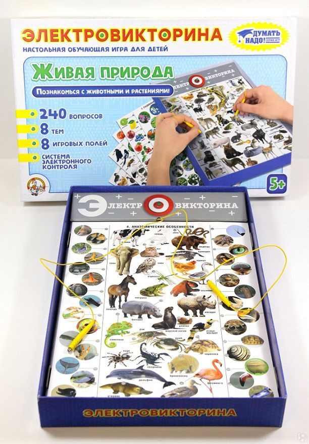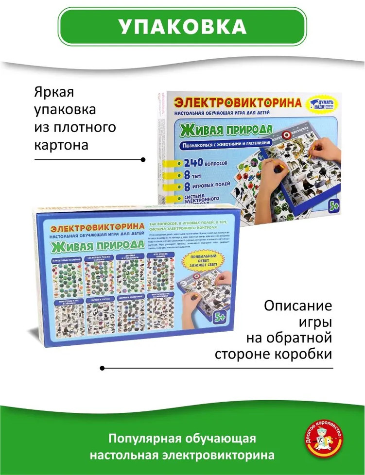 Десятое королевство Настольная интерактивная игра (электровикторина) «Живая природа»упаковка хрупкость качество В данный момент этот товар отсутствует в продаже. Возможно, у нас найдется аналогичный или похожий товар здесь. Серия: Думать надо! Эта обучающая игра познакомит детей с животными и растениями. Игроки узнают, как выглядят детеныши животных и их жилища, у каких животных самцы отличаются по внешнему виду от самок, научатся распознавать деревья, кустарники и сельскохозяйственные растения. Игра расширяет кругозор, увеличивает словарный запас, развивает память, произвольное внимание и логическое мышление. Благодаря системе электронного контроля ребенок может играть самостоятельно, не прибегая к постоянной помощи взрослого. Игра рассчитана на 1-2 участников и предназначена для детей в возрасте от 5 до 9 лет. |