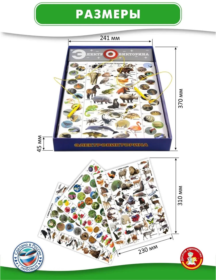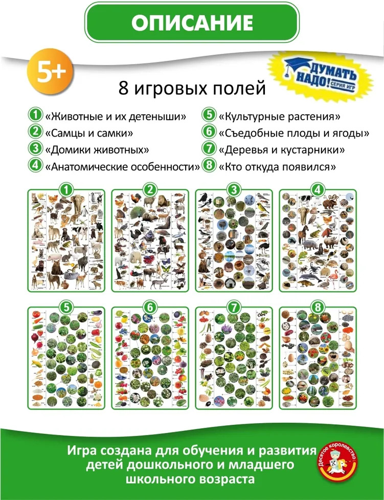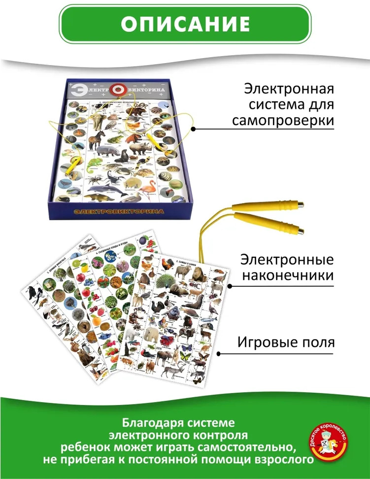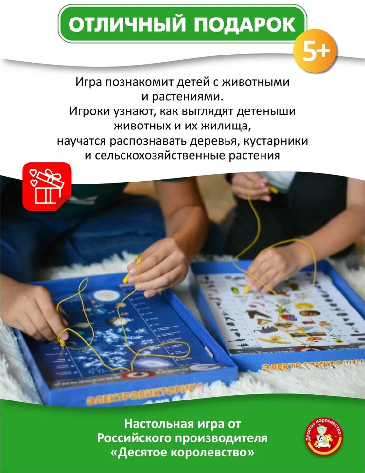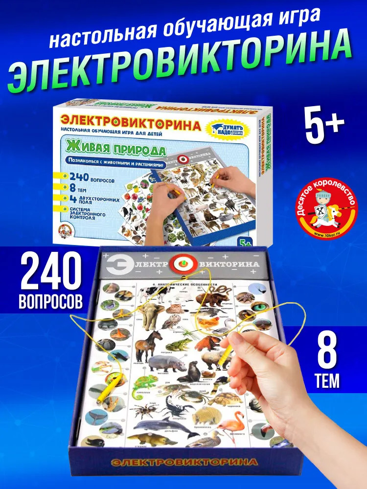 Десятое королевство Настольная интерактивная игра (электровикторина) «Живая природа»упаковка хрупкость качество В данный момент этот товар отсутствует в продаже. Возможно, у нас найдется аналогичный или похожий товар здесь. Серия: Думать надо! Эта обучающая игра познакомит детей с животными и растениями. Игроки узнают, как выглядят детеныши животных и их жилища, у каких животных самцы отличаются по внешнему виду от самок, научатся распознавать деревья, кустарники и сельскохозяйственные растения. Игра расширяет кругозор, увеличивает словарный запас, развивает память, произвольное внимание и логическое мышление. Благодаря системе электронного контроля ребенок может играть самостоятельно, не прибегая к постоянной помощи взрослого. Игра рассчитана на 1-2 участников и предназначена для детей в возрасте от 5 до 9 лет. |