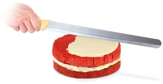 Хорошо режет бисквиты, кексы. Длина лезвия 30 см, что очень удобно для разрезания больших диаметров. Рекомендую