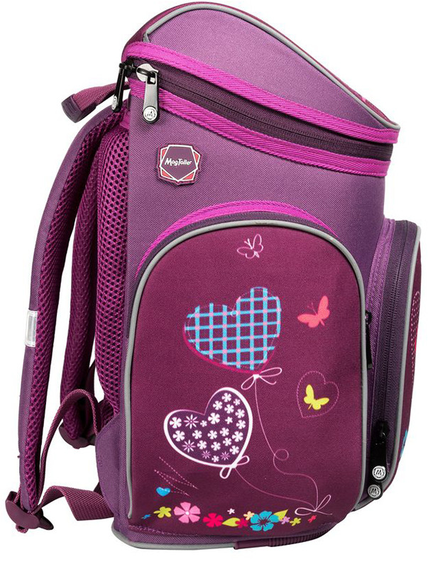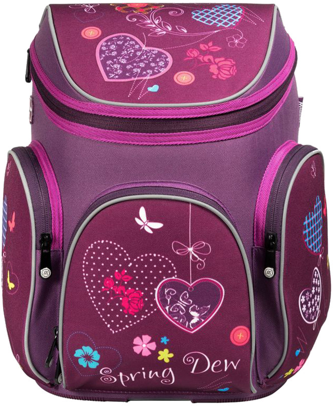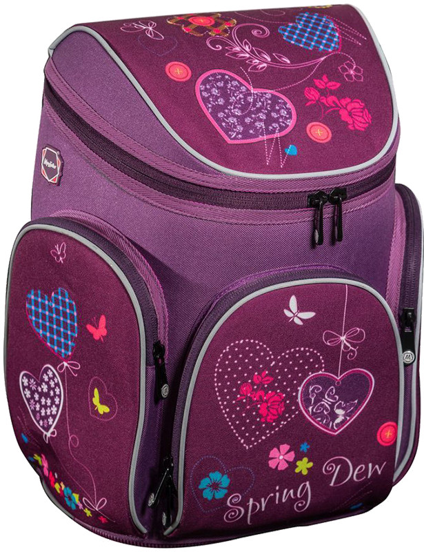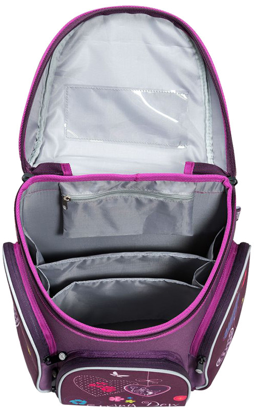 Ранец имеет одно вместительно отделение, которое закрывается клапаном на застежку-молнию с двумя бегунками. Внутри отделения находятся два мягких разделителя для учебников и накладной карман на молнии. На лицевой стороне ранца располагается накладной карман на молнии, внутри которого находится органайзер для хранения мобильного телефона, пишущих принадлежностей и других мелочей. По бокам располагаются два кармана на молниях. Ранец оснащен эргономичной ручкой для переноски в руке.